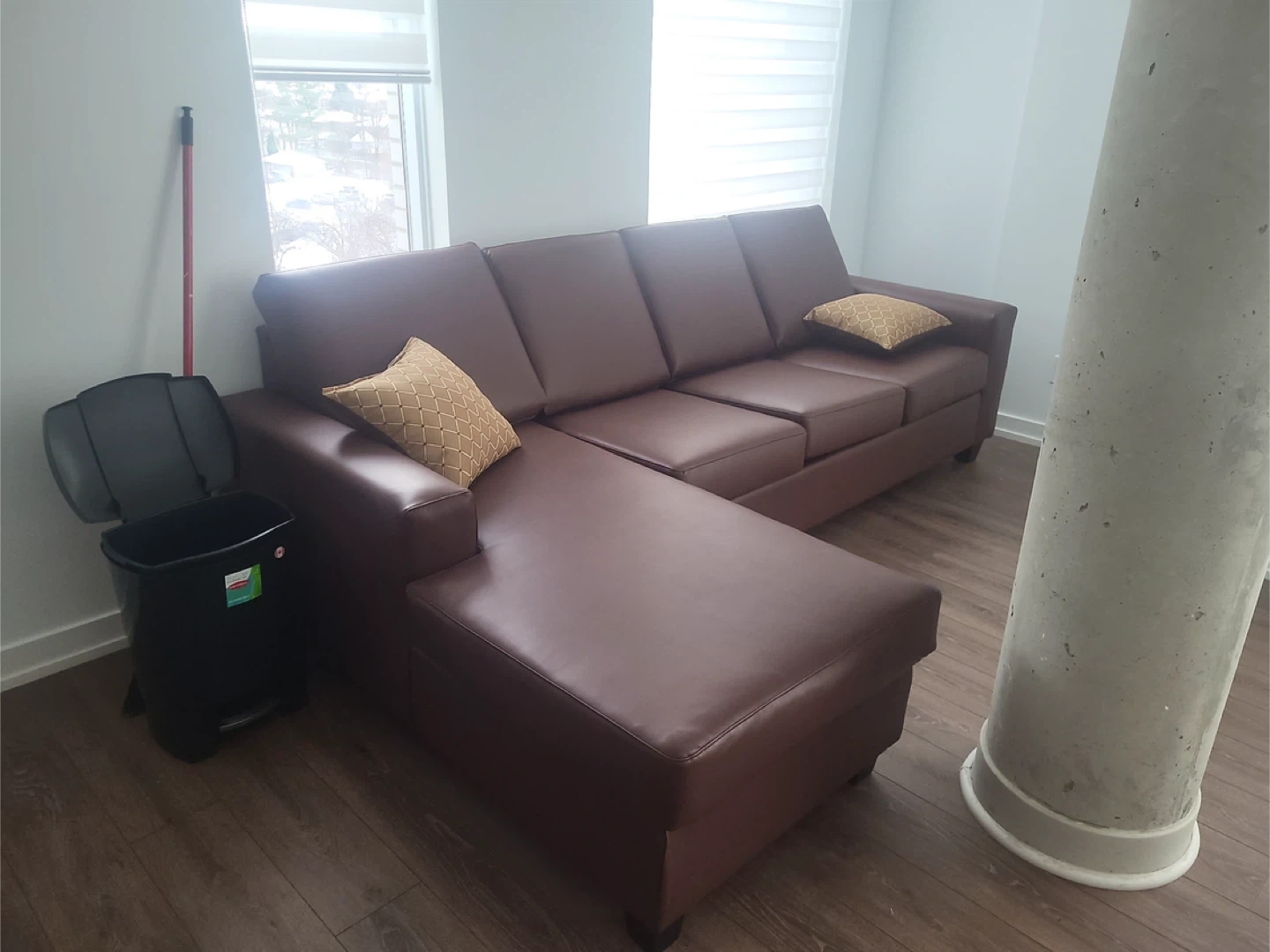 This is a spacious brown sectional sofa with a chaise attachment. It comes with two decorative throw pillows. Its faux leather material is easy to wipe clean. It's perfect for lounging or entertaining guests.