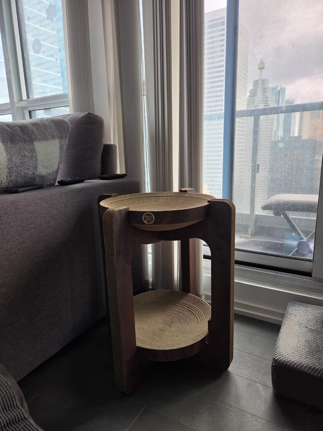 This Necoichi cat scratcher tower features two tiers of textured surfaces for scratching. It's made from durable cardboard and wood-like composite material. A fun spot for cats to play and scratch!