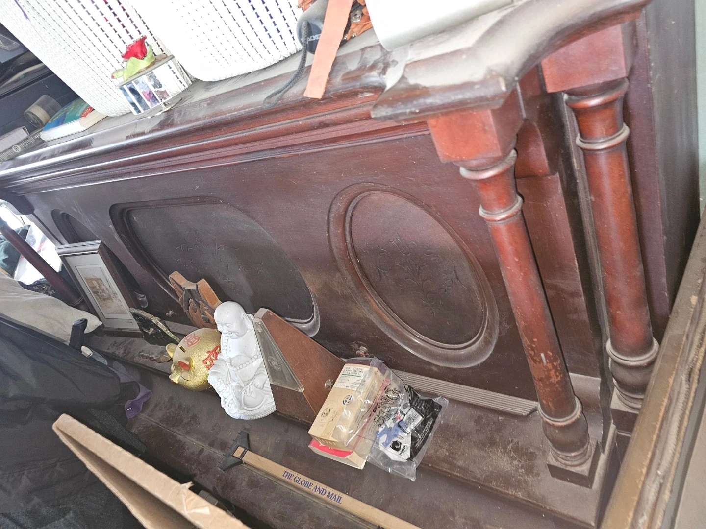 This is a beautiful antique wooden piano. It's a great statement piece for any room! It has a rich wooden finish and classic ivory keys. This piano would be a wonderful addition for a music enthusiast or collector.