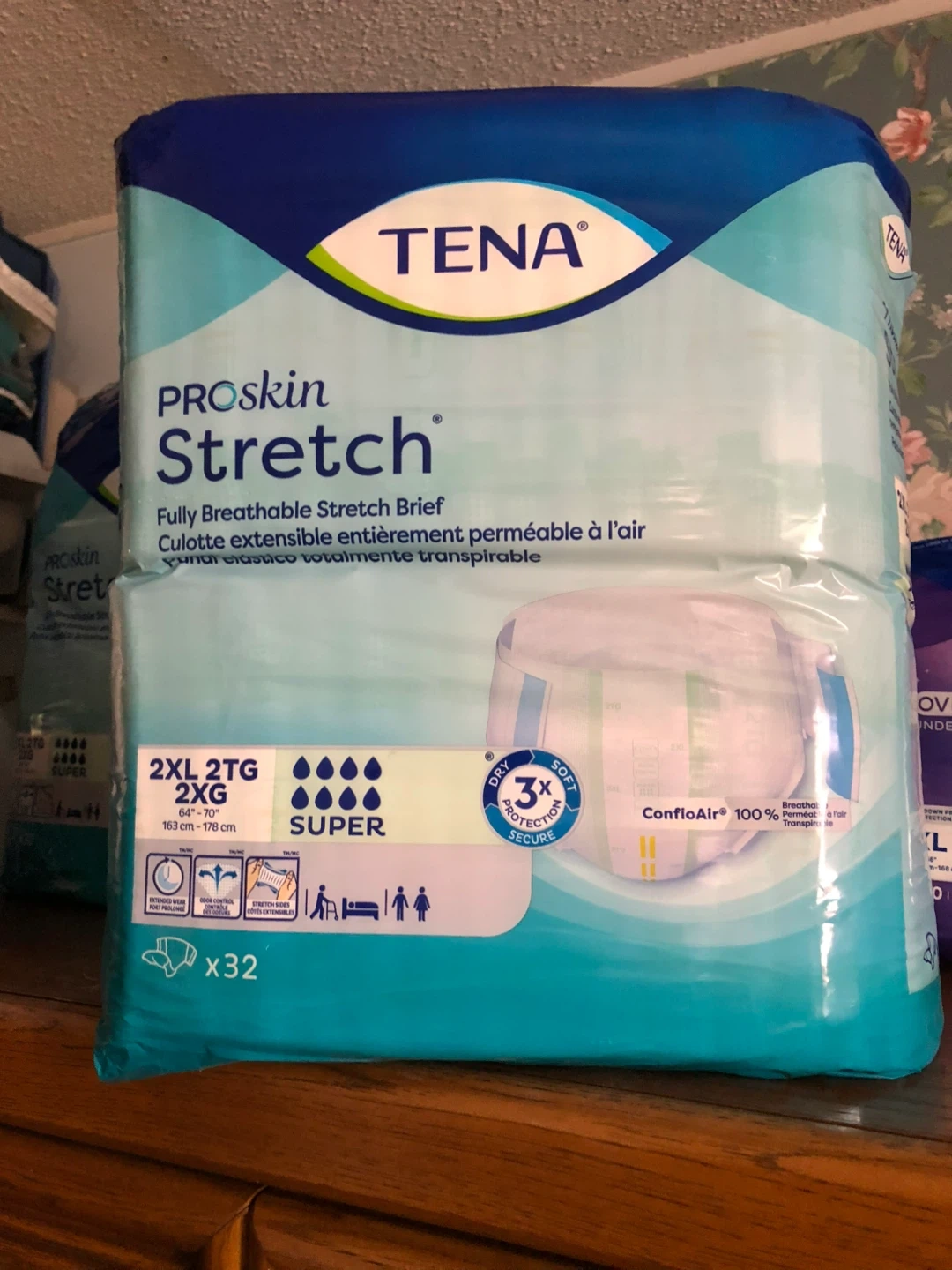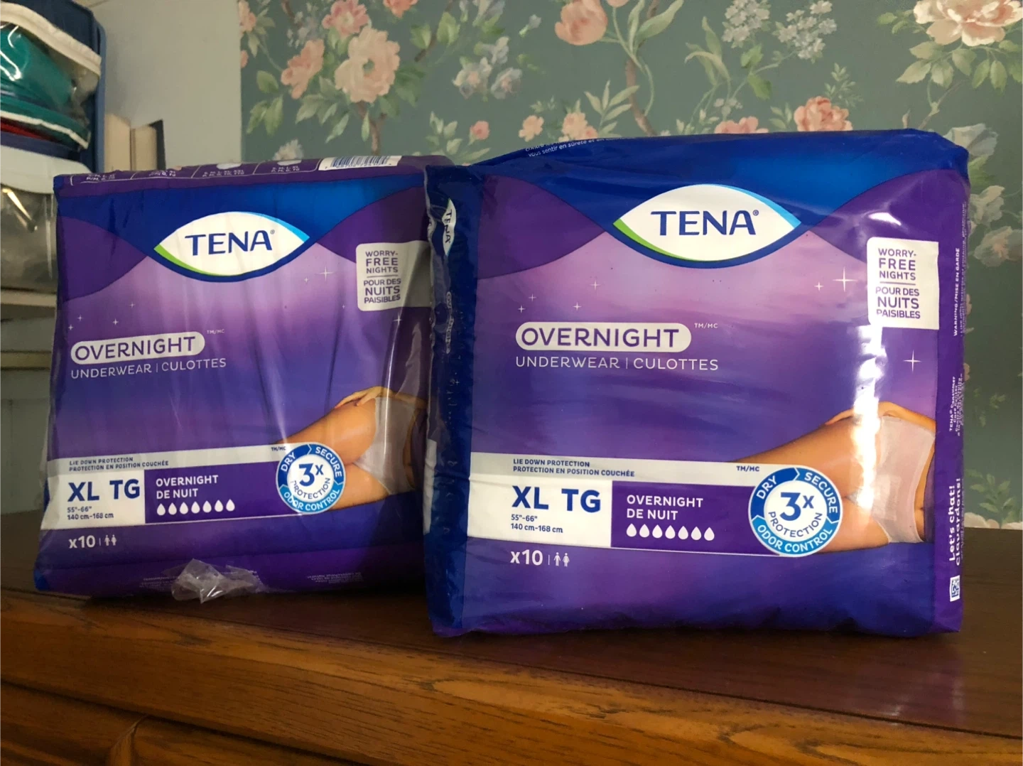 Two packages of TENA adult incontinence products. One is TENA ProSkin Stretch, size 2XL, with 32 briefs. The other is TENA Overnight Underwear, size XL, with 10 pads. Both offer 3X protection. Will sell separately or together, open to offers..$15 for the 32 briefs (have 2 packs) and $5 for the Overnight.