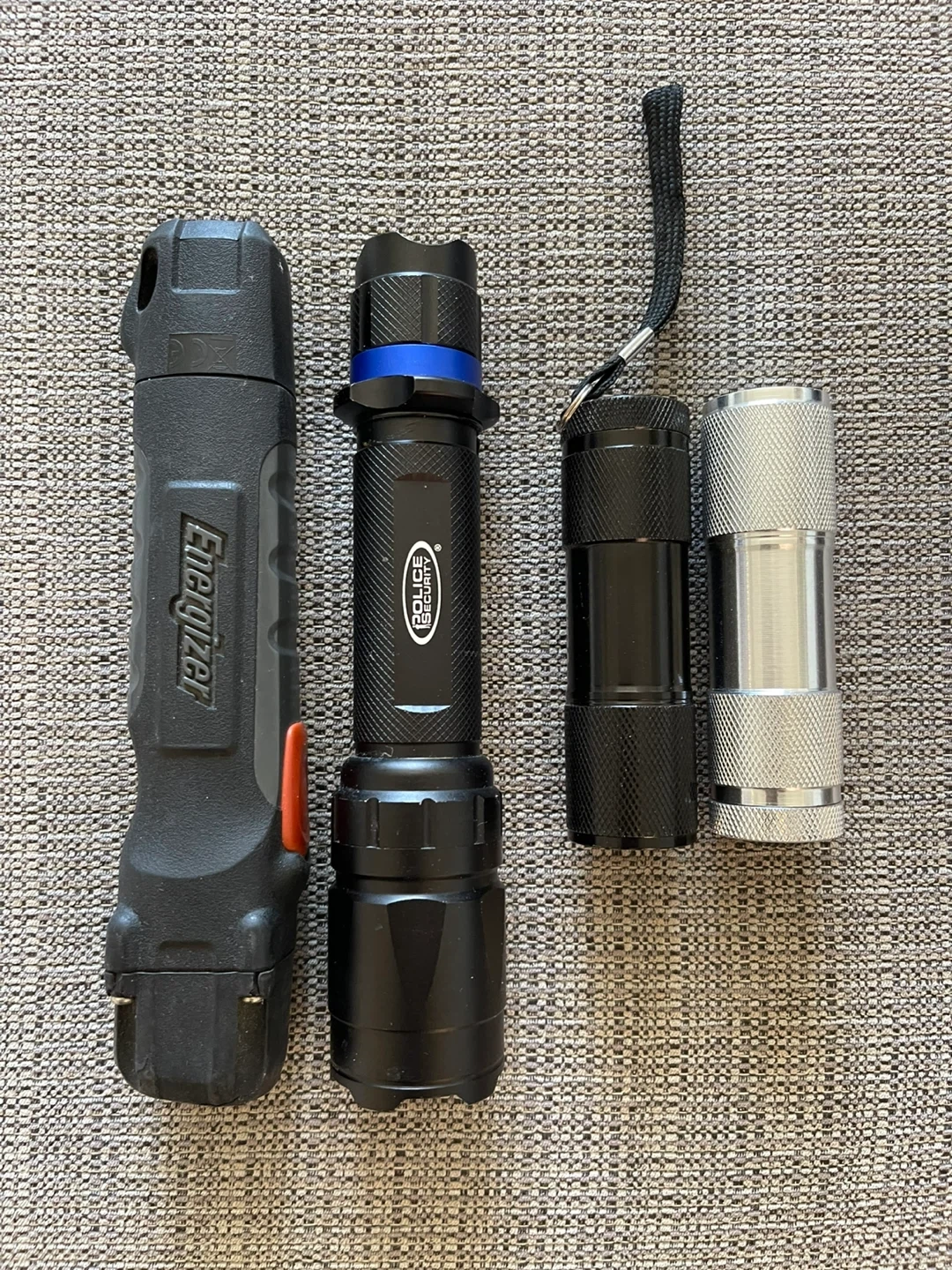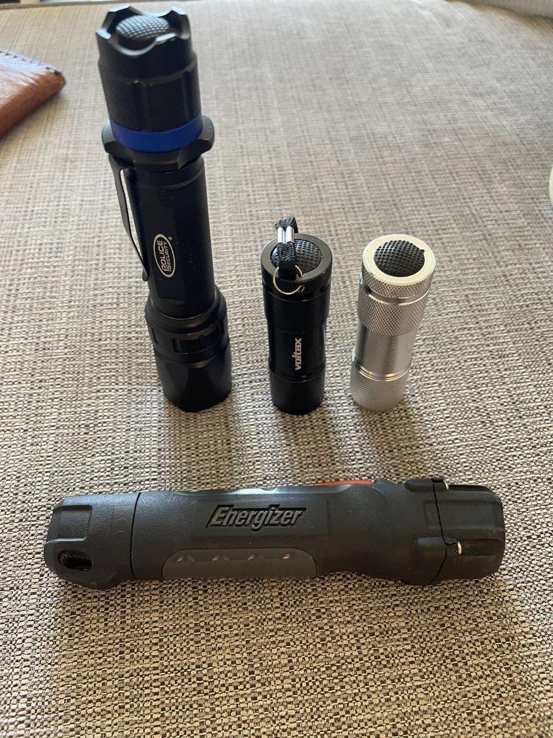 Four flashlights from brands Energizer, Police, and Voltax, plus an unbranded aluminum one. They come in various sizes and materials. Handy for power outages or outdoor adventures!