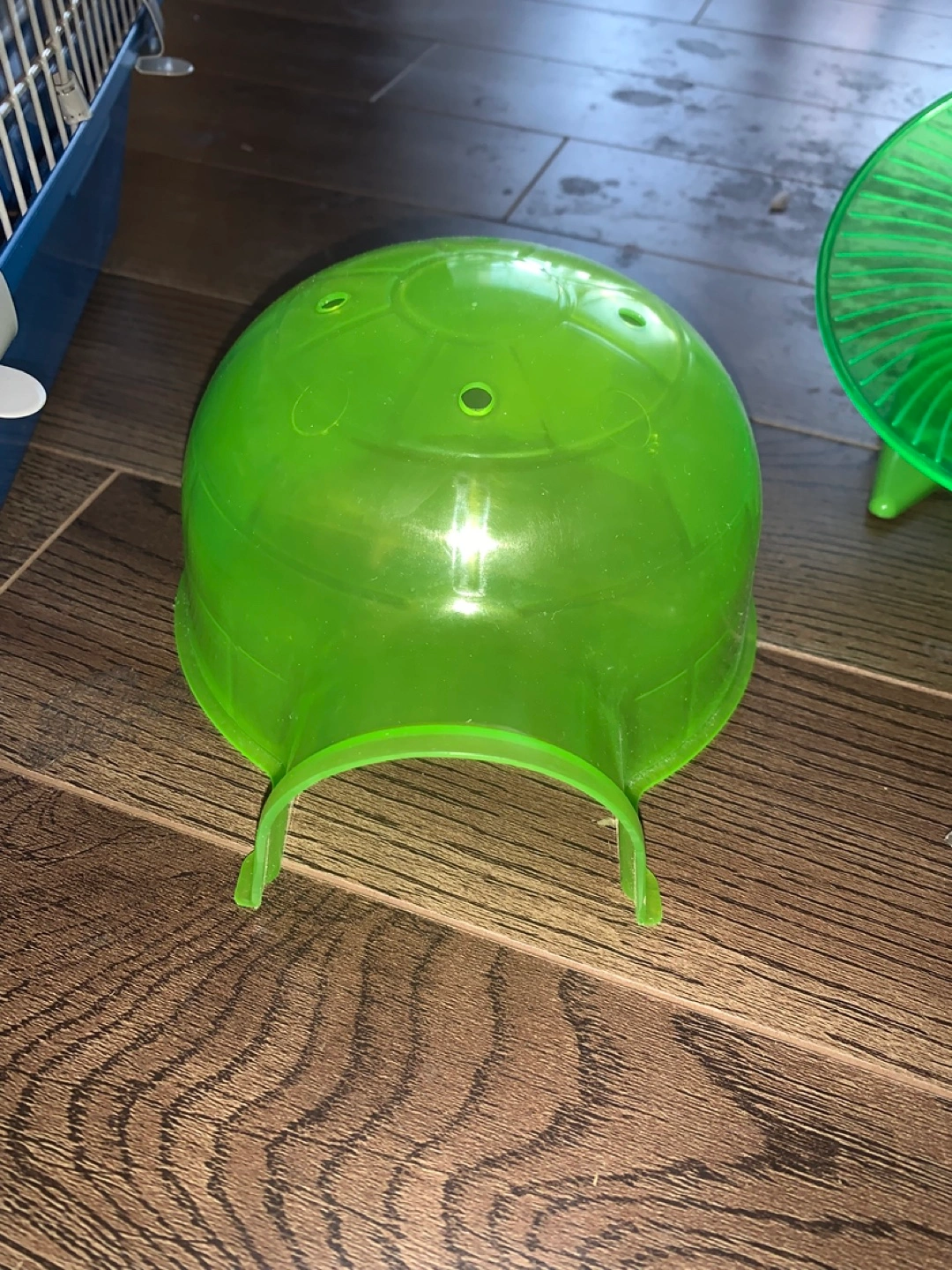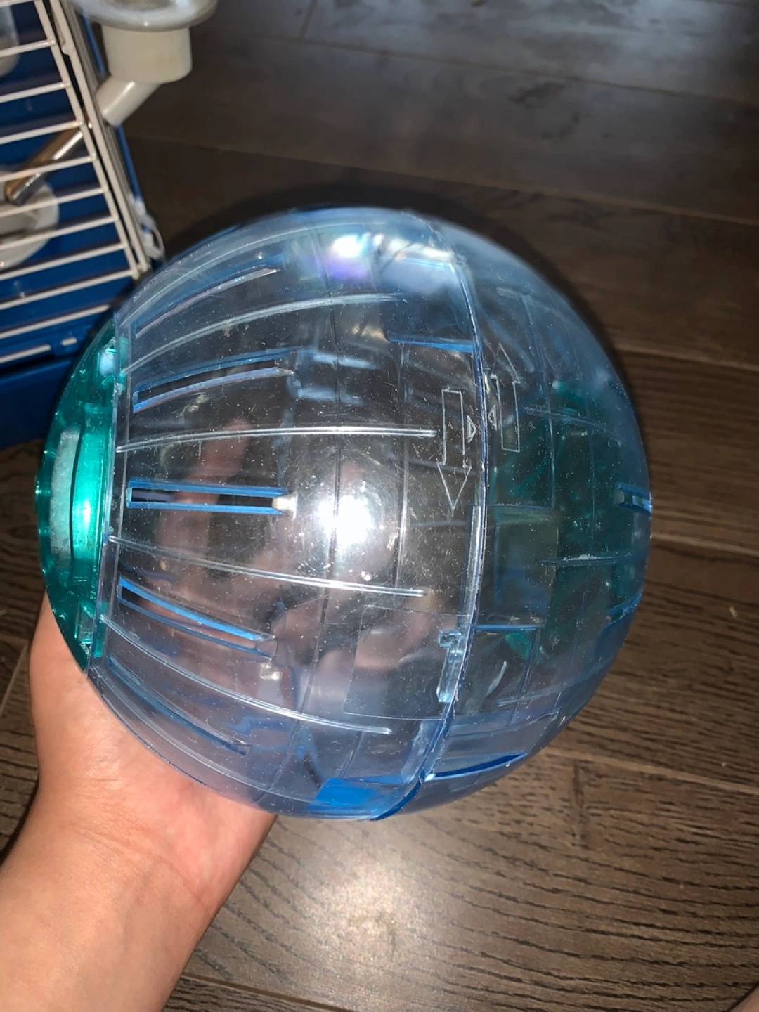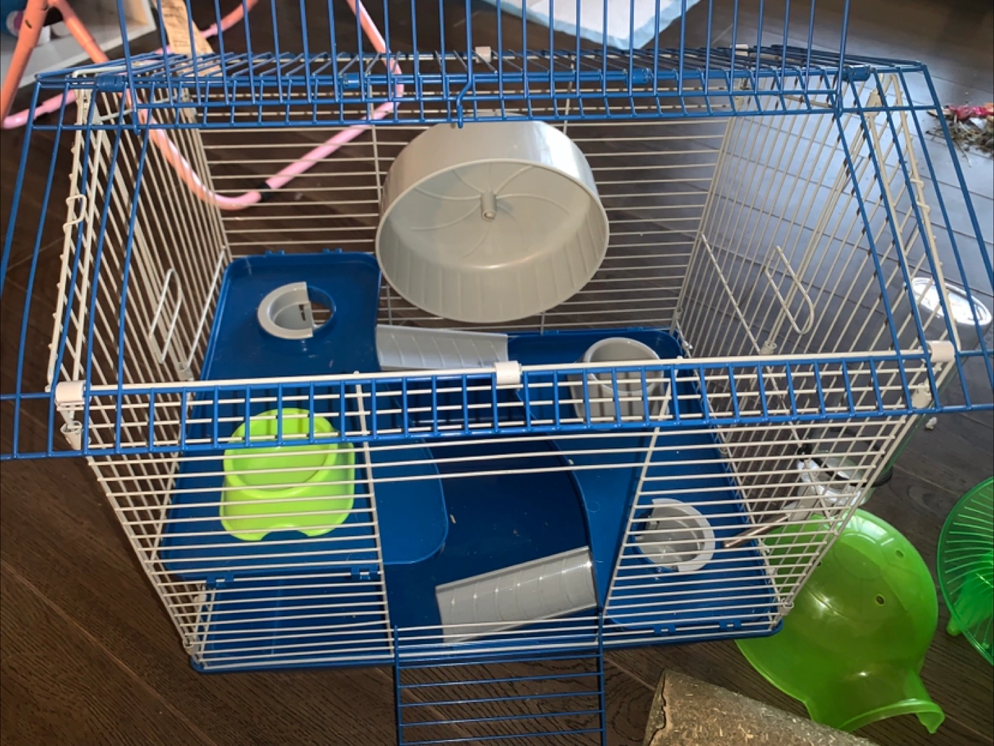 Comes with a blue and white wire cage, food pellets, a chew toy, a tunnel, 2 wheels ,a ball , water bottle,2 water bottles , coconut hut and a green hideout. This cage is suitable for small pets like hamsters.