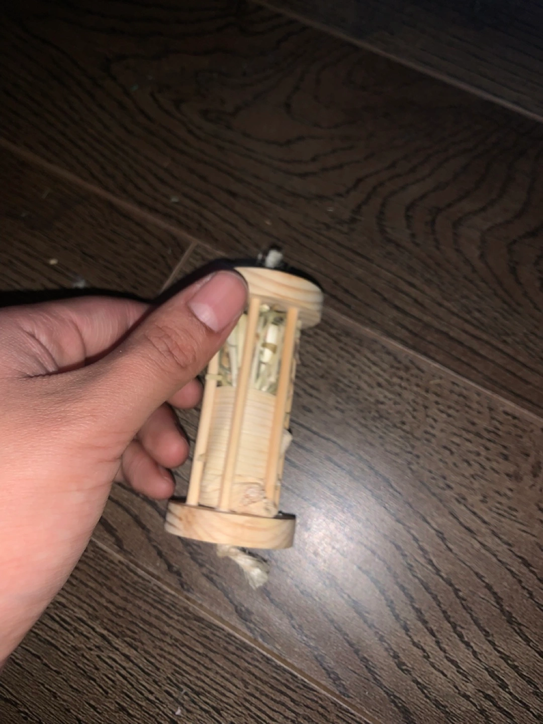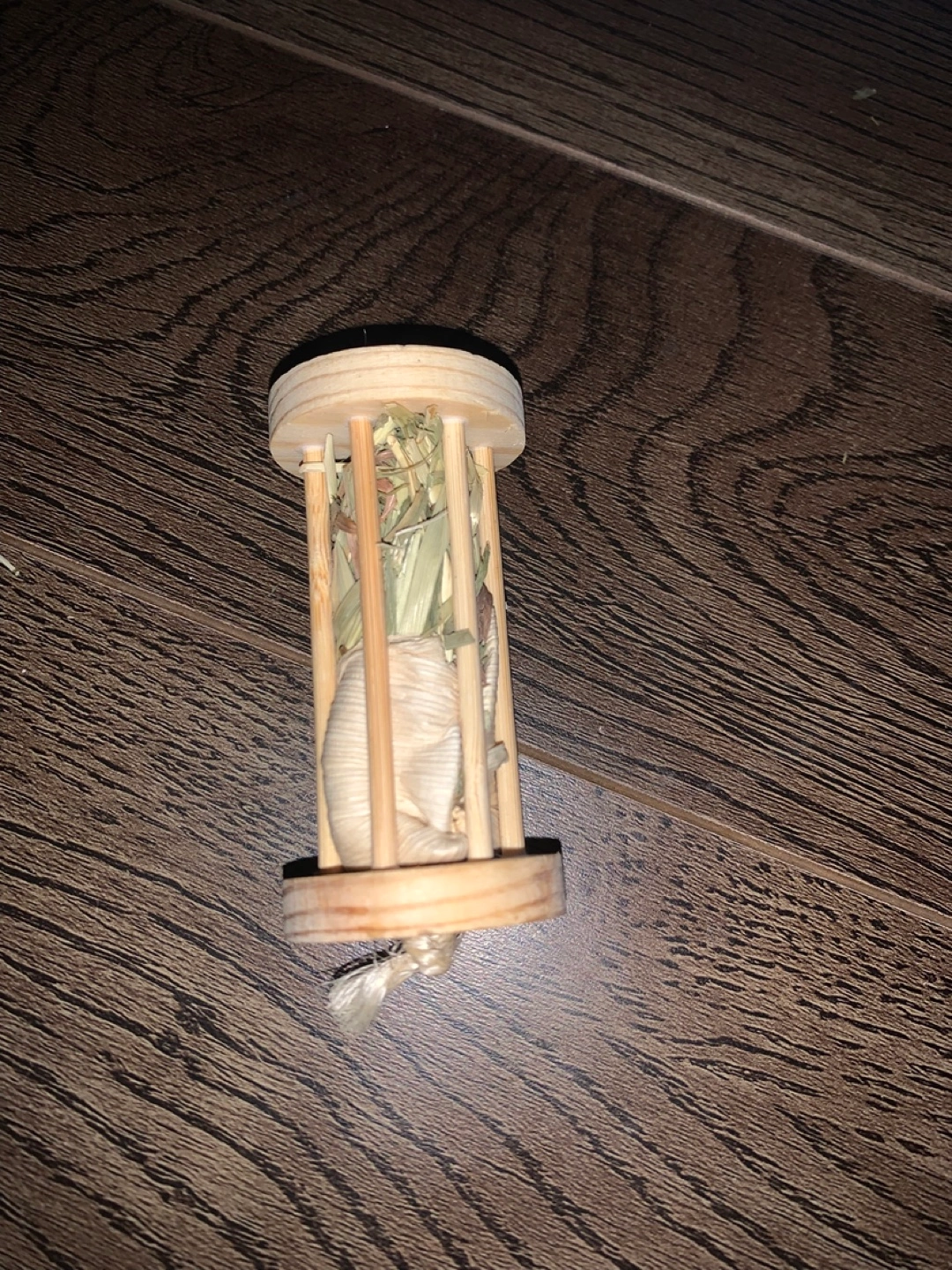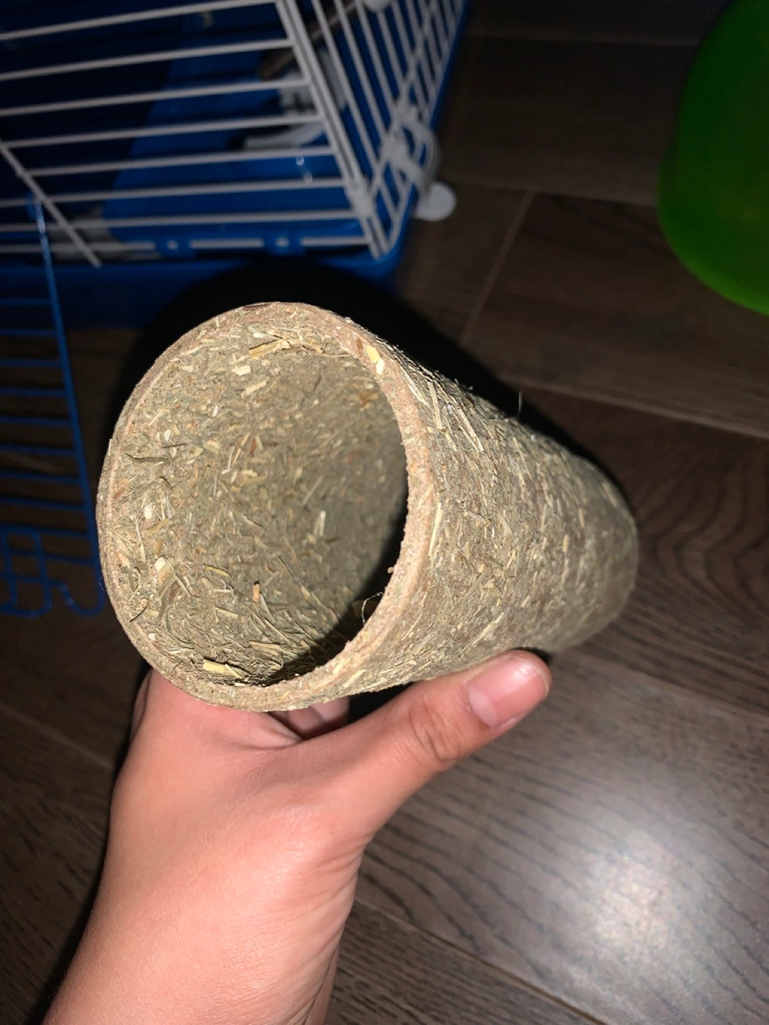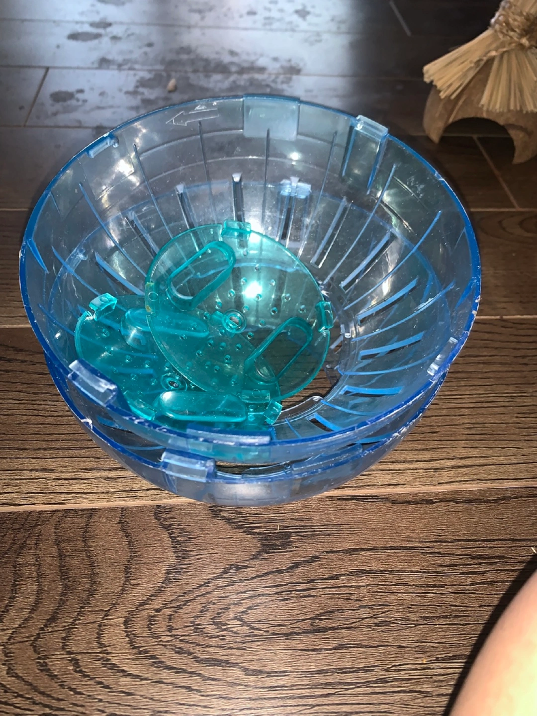 Comes with a blue and white wire cage, food pellets, a chew toy, a tunnel, 2 wheels ,a ball , water bottle,2 water bottles , coconut hut and a green hideout. This cage is suitable for small pets like hamsters.