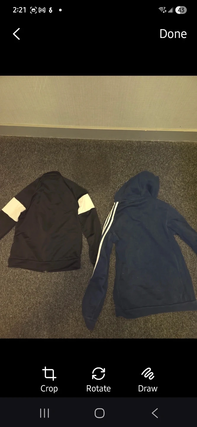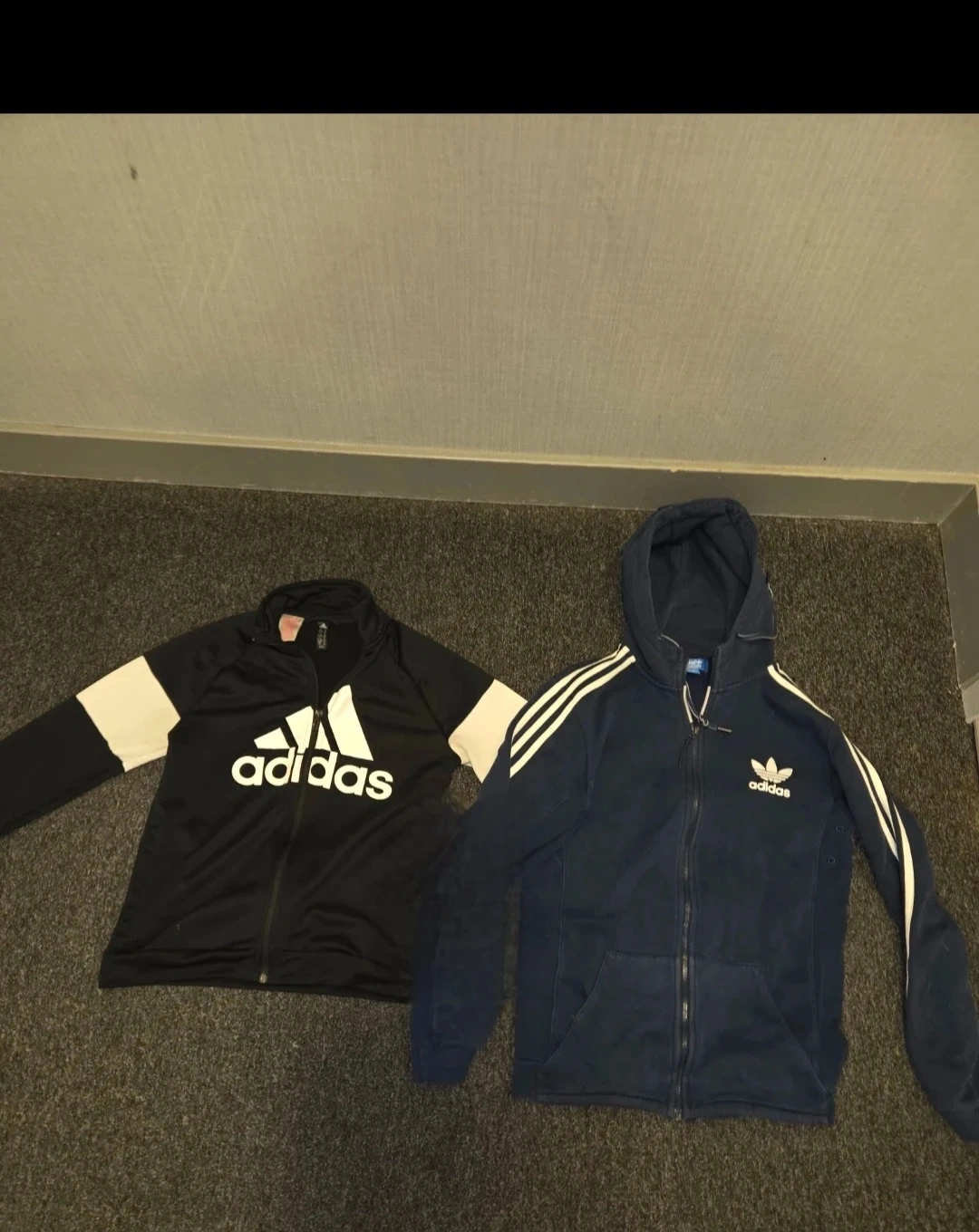 Two Adidas bundle Includes a black track jacket with white stripes on the sleeves and a navy blue hooded zip-up jacket with white stripes. Great for casual wear or sports activities.