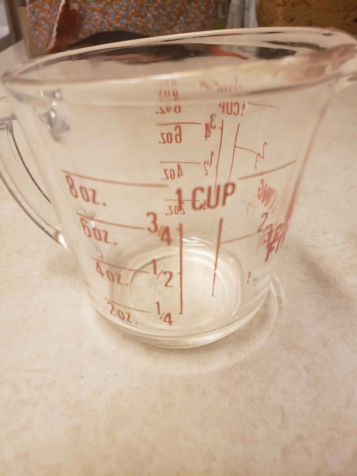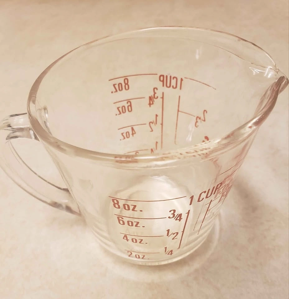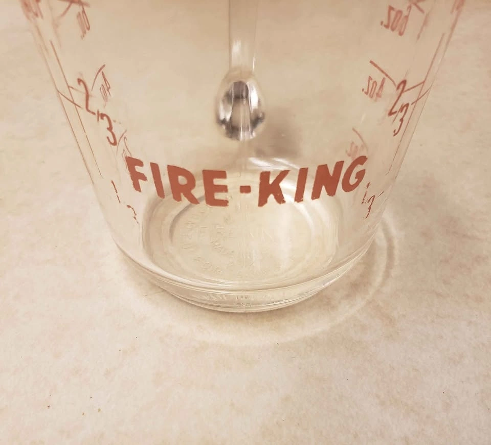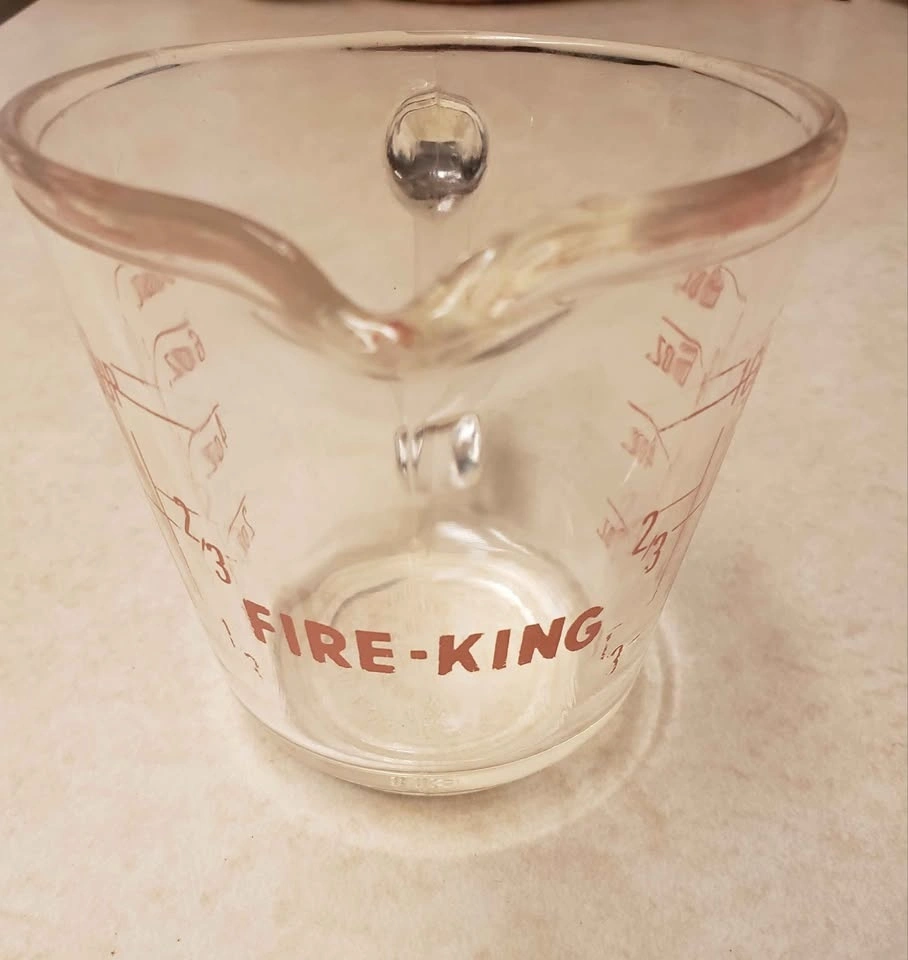 Vintage Fire King 1 cup glass measuring cup with handle and pour spout. The 1/3 marking is still visible but beginning to rub off consistent with age and use. Price reflects condition. Otherwise in good shape. Clean. No chips or cracks. Red logo and red writing on this version. Pick up in Upper Lonsdale North Vancouver.