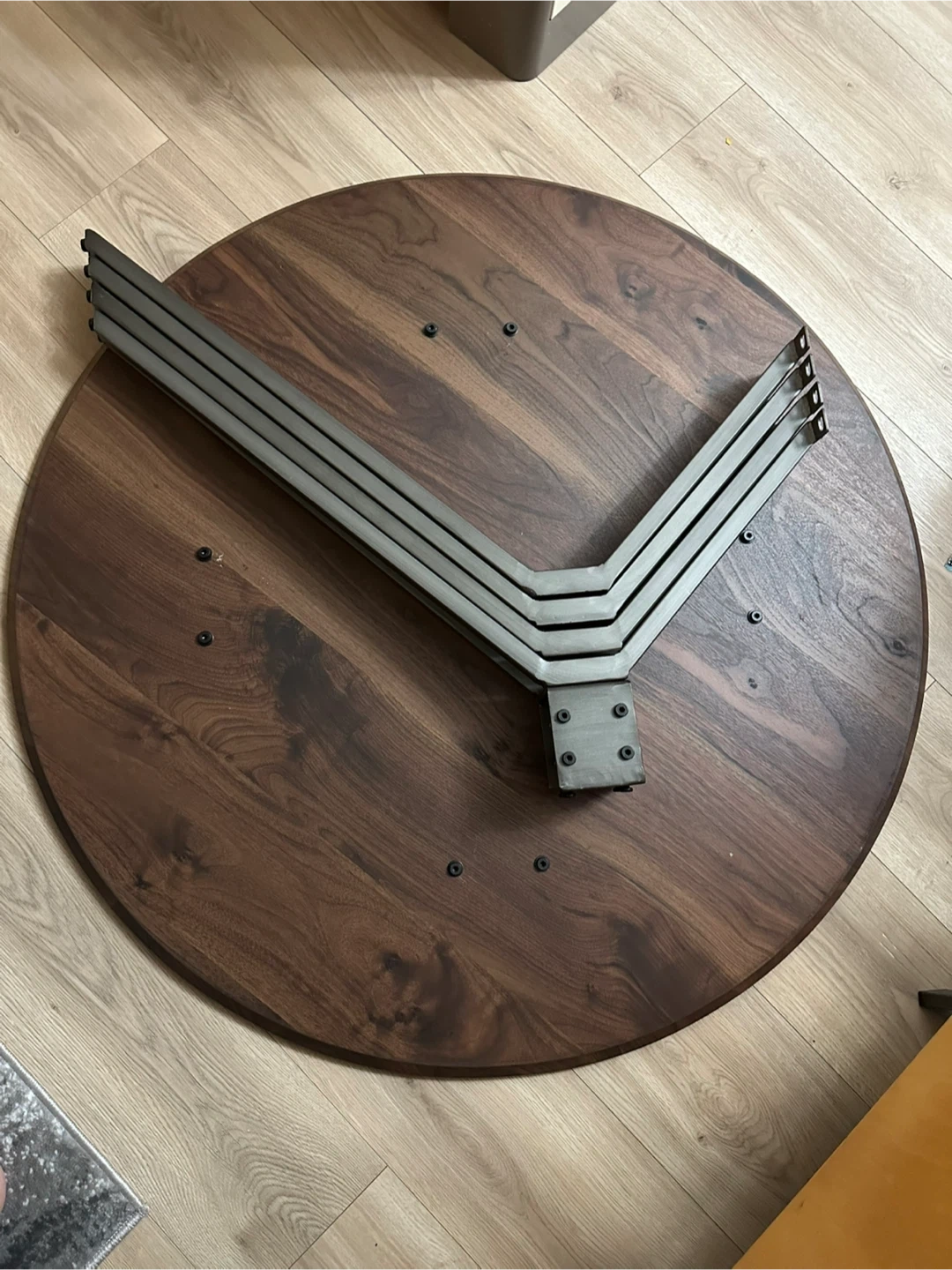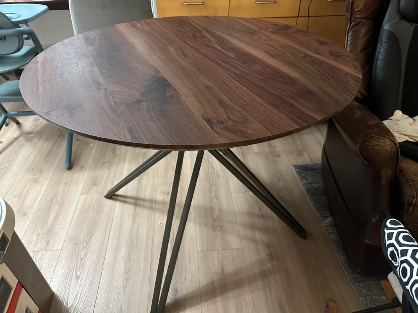 A stylish round dining table with a rich walnut wood top and a unique geometric metal base. It's sturdy and offers a modern aesthetic. This table is perfect for smaller dining spaces or as a charming accent piece.
