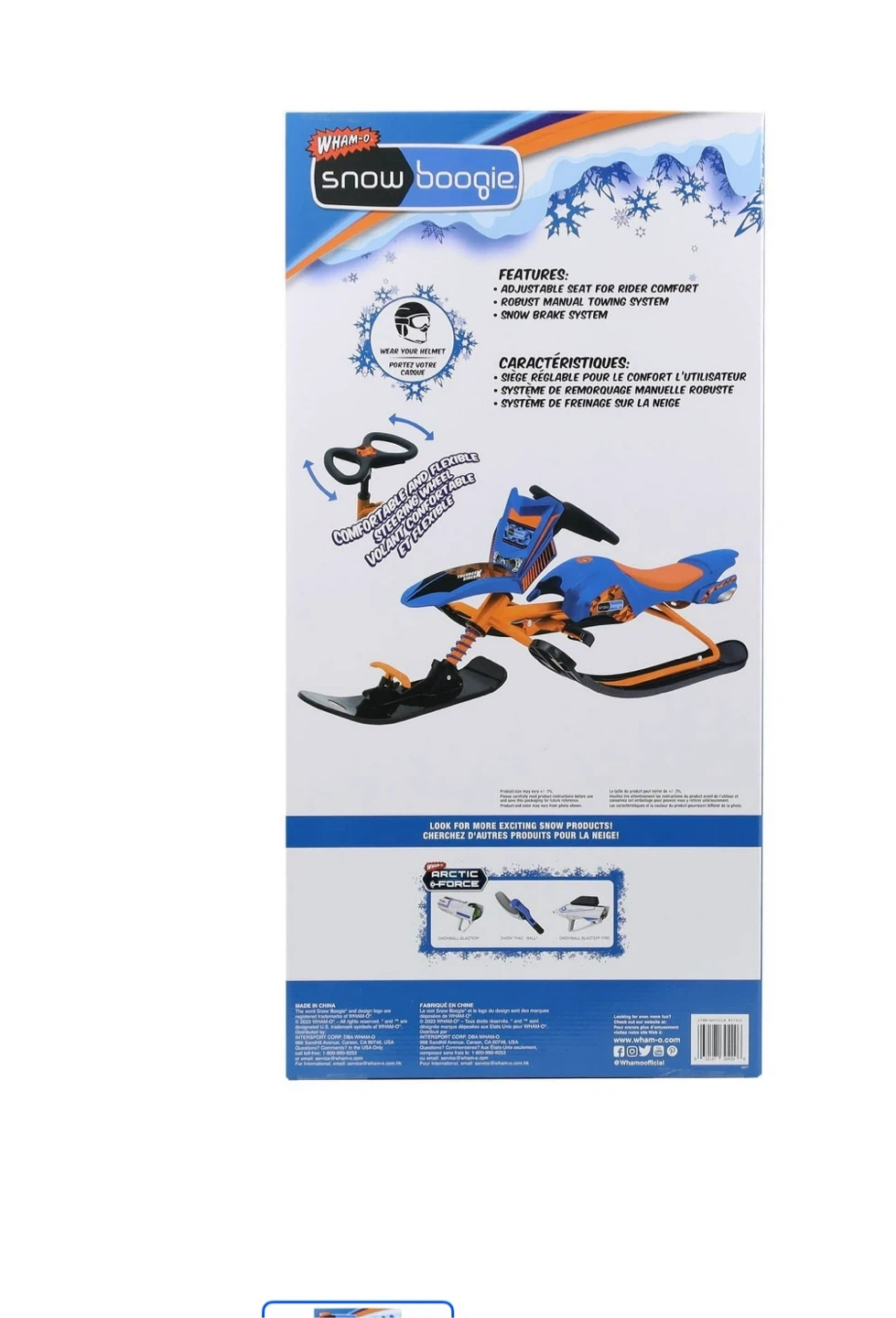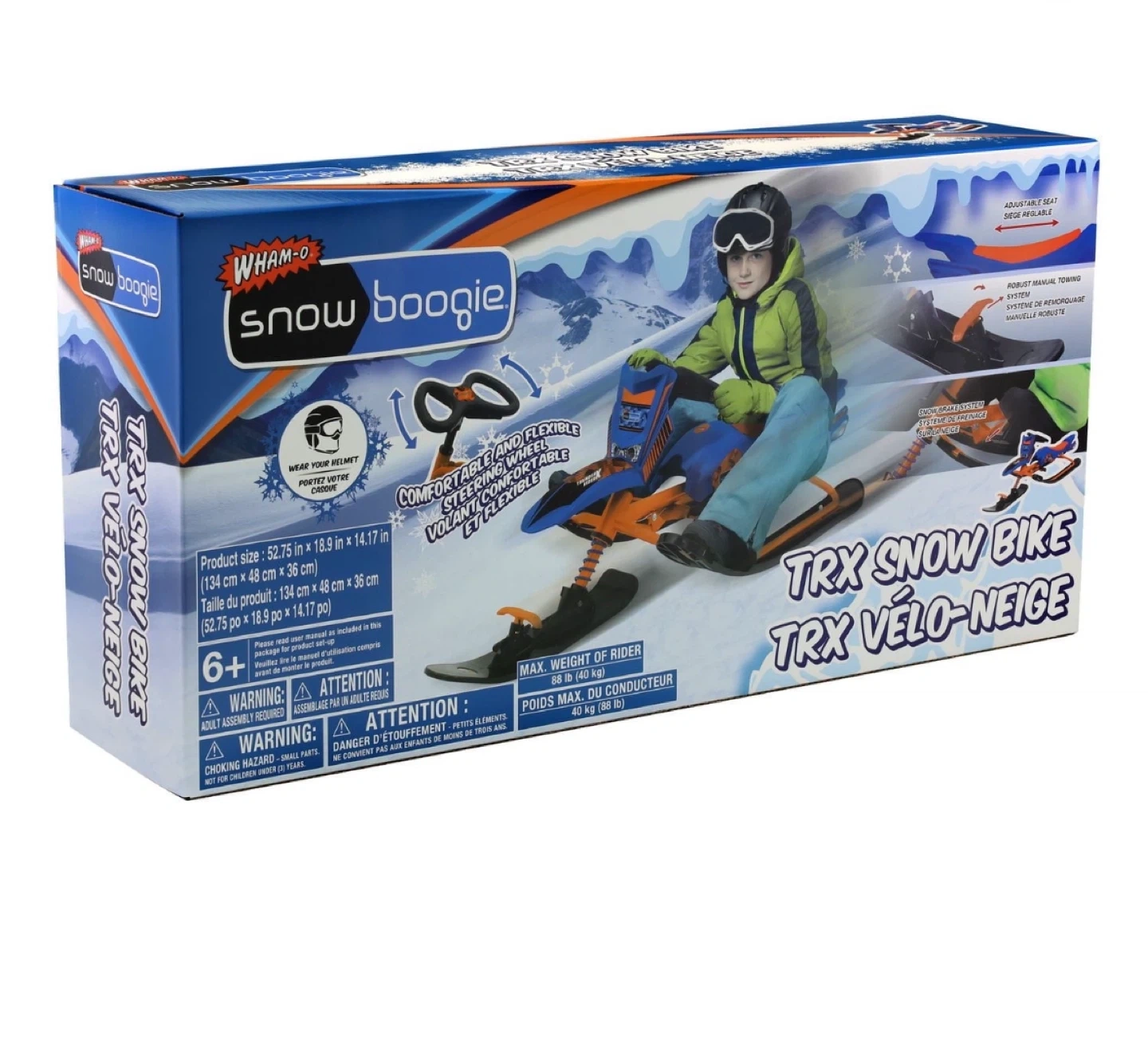 Hit the snow like an avalanche with the Wham-o® Snow Boogie® TRX Snow Bike. The Snow Bike is the perfect snow mobile vehicle for kids ages 6+. The bike has safety features such as a manual towing/brake system. User safety is assured through an adjustable seat feature and ergonomic handle grips. Weight limit of 88 lbs. Now you can enjoy hours of fun and be sure your snow day will be a blast!