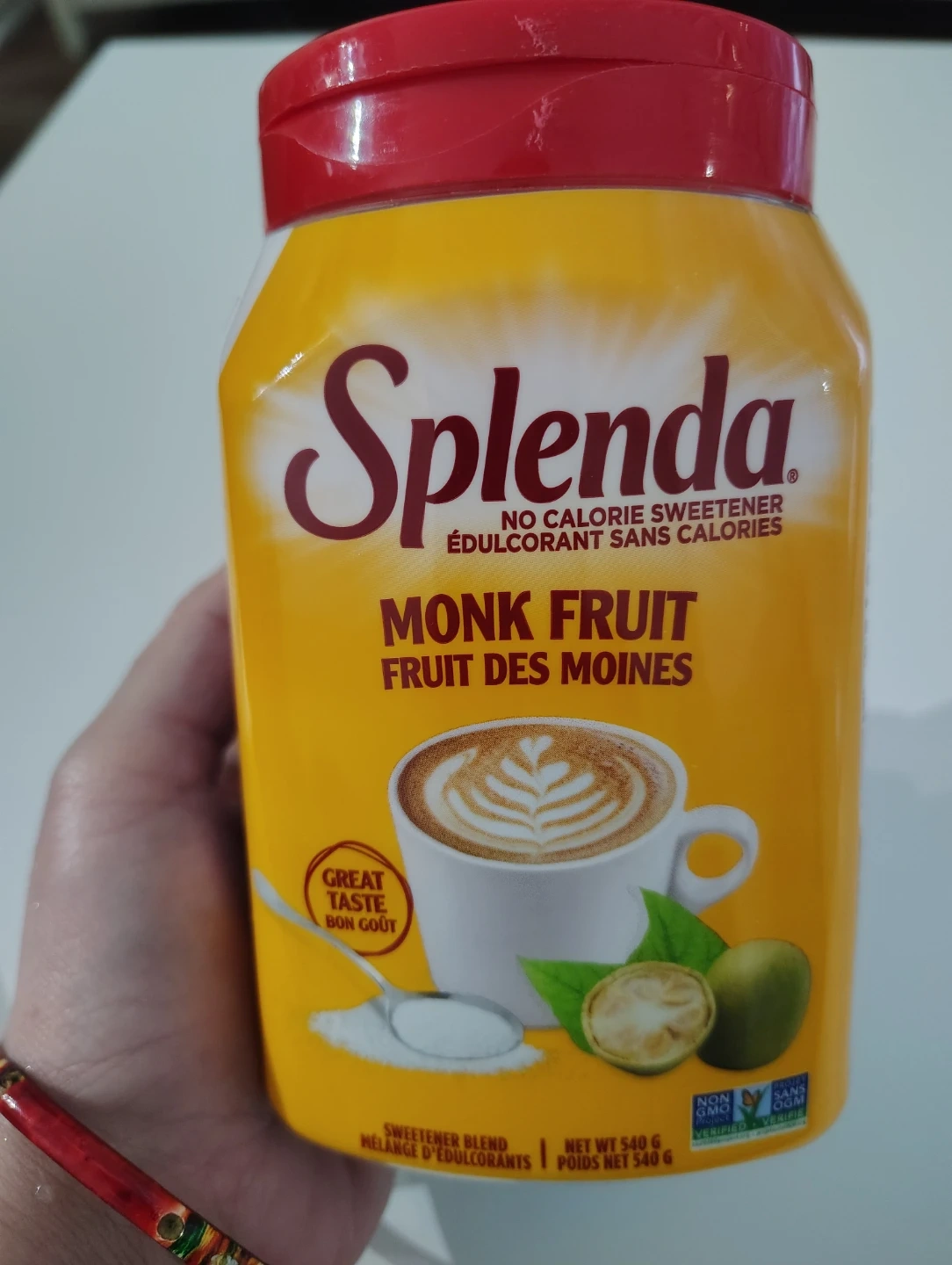 Selling a 540g container of Splenda Monk Fruit sweetener blend. It's a no-calorie sweetener that's great for baking and beverages.