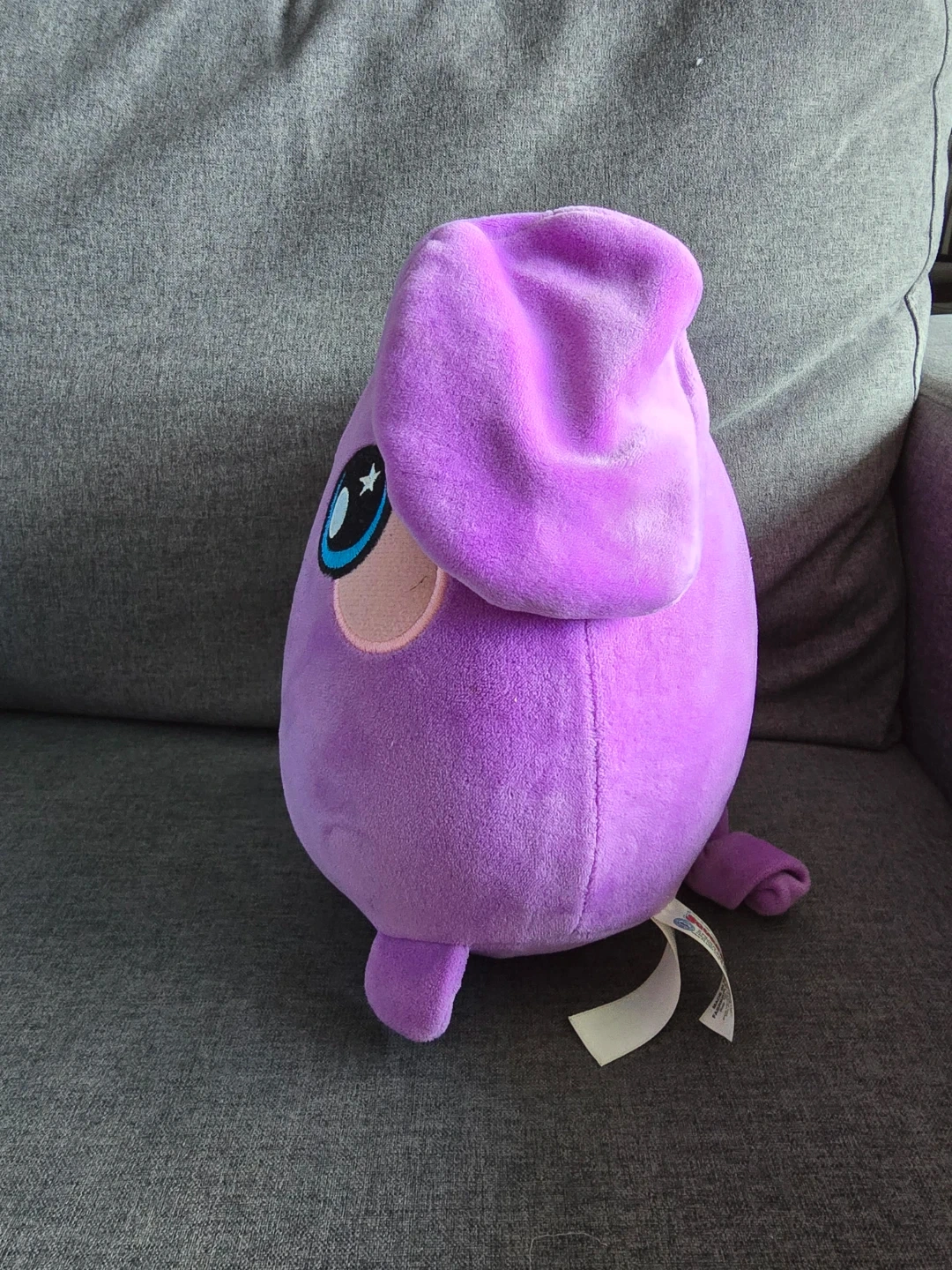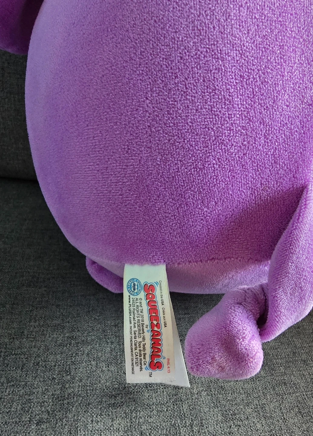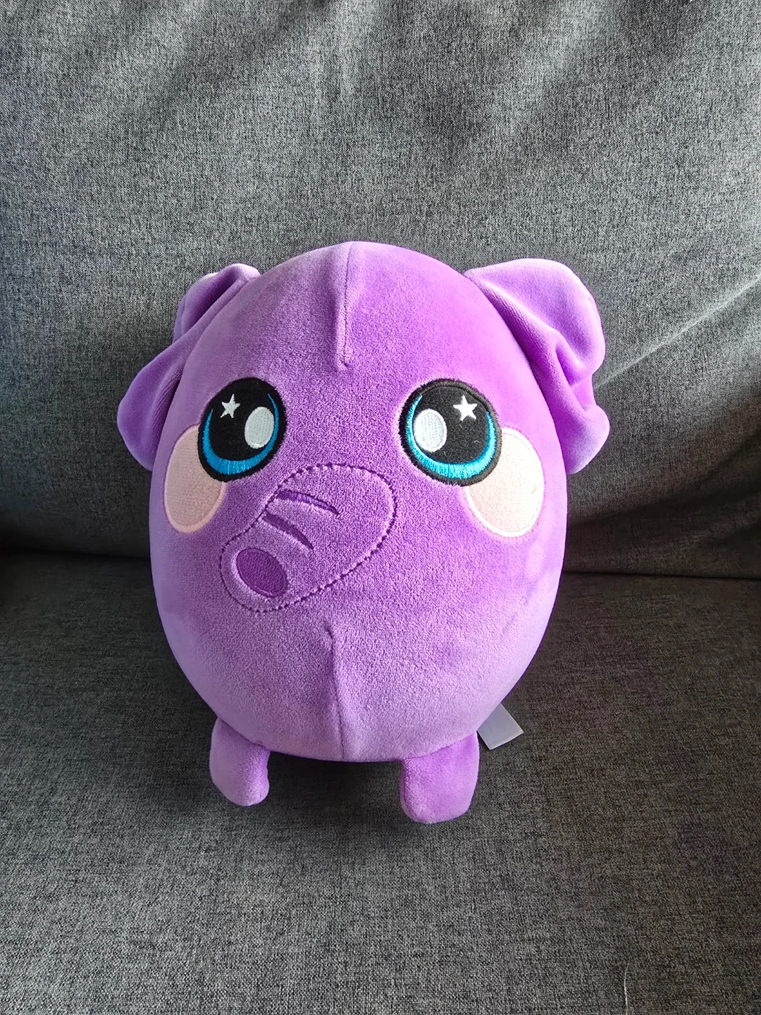 This is a soft, purple plush elephant toy from Squeezamals. It's a cuddly friend made for playtime. Perfect for kids who love stuffed animals!