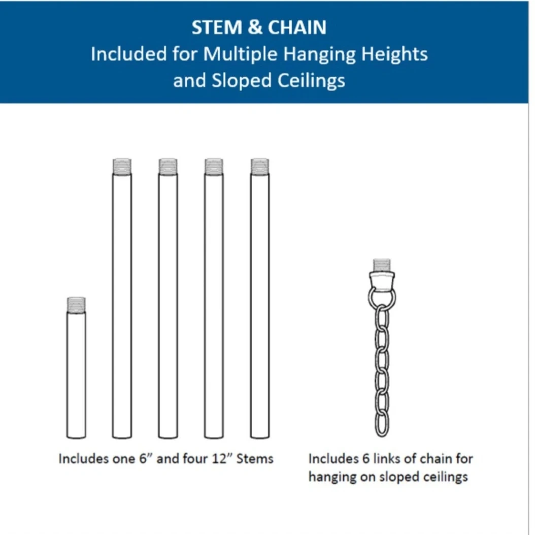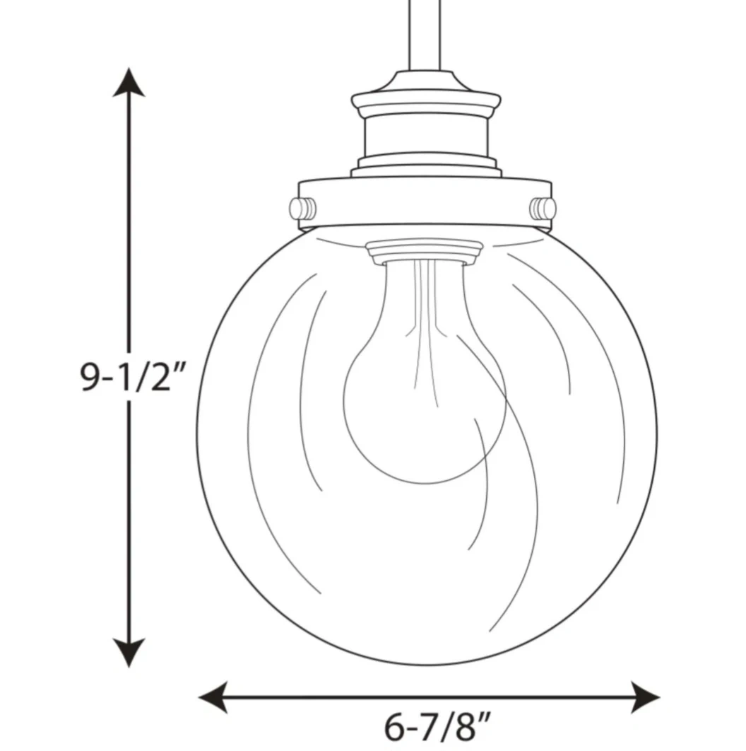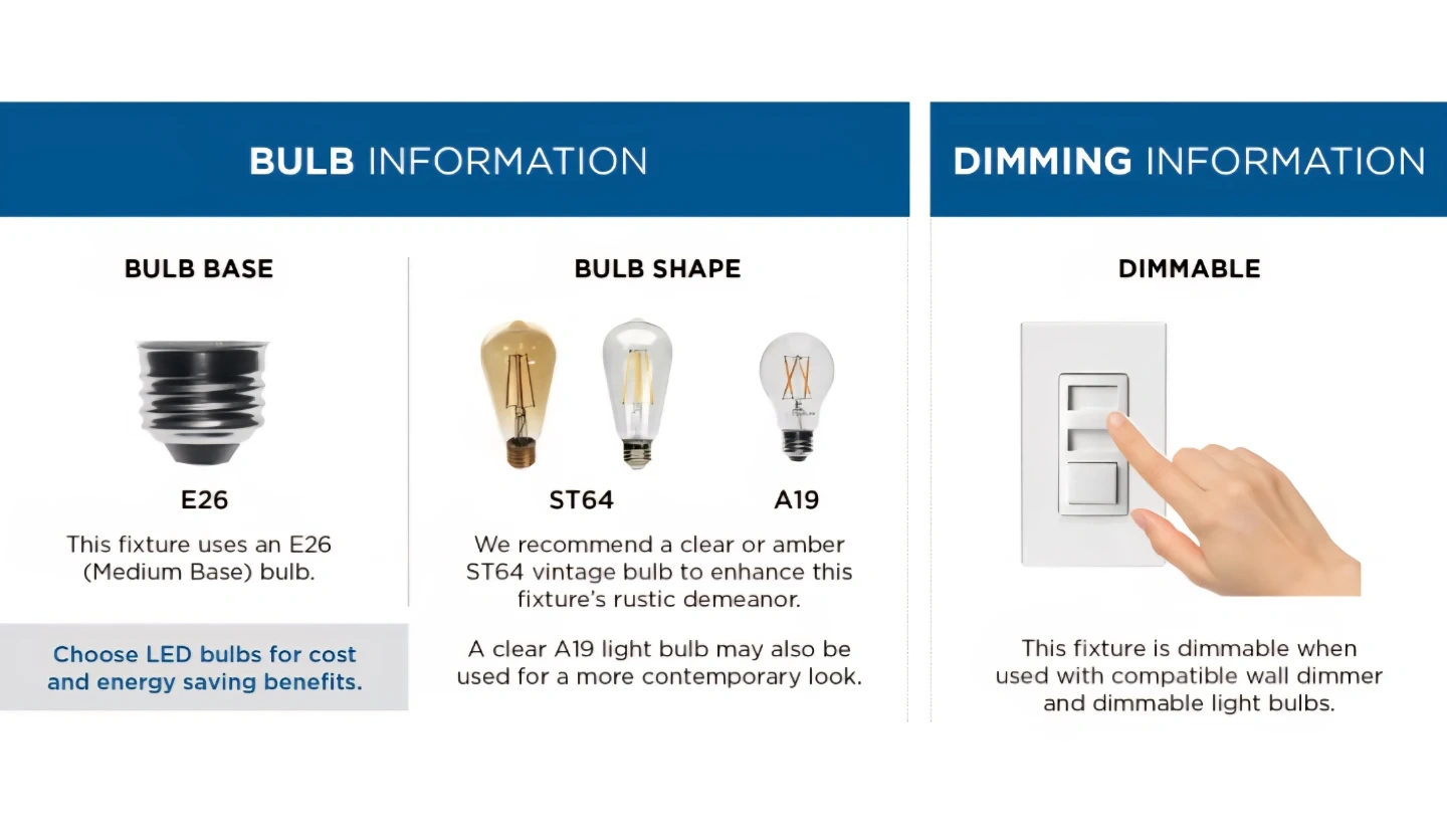 The fixture uses an E26 (Medium Base) bulb. For the bulb shape, the manufacturer recommends a clear or amber ST64 vintage bulb to enhance this fixture's rustic demeanor. A clear A19 light bulb may also be used for a more contemporary look. The item includes one 6" and four 12" stems, plus 6 links of chain for hanging on sloped ceilings. The dimensions are 9-1/2" in height and 6-7/8" in diameter