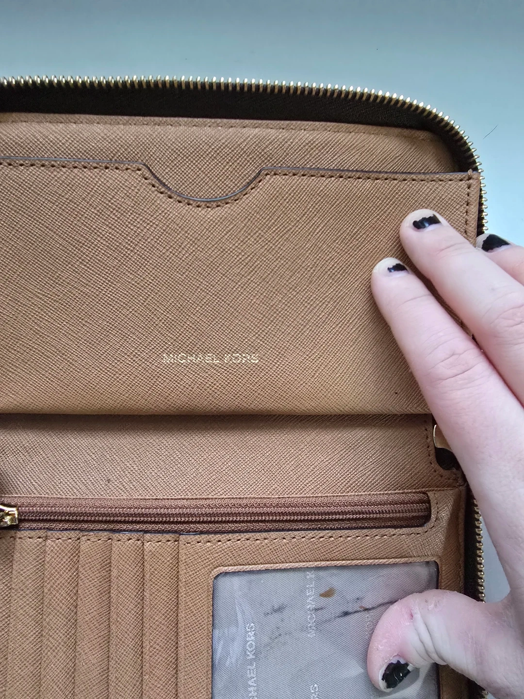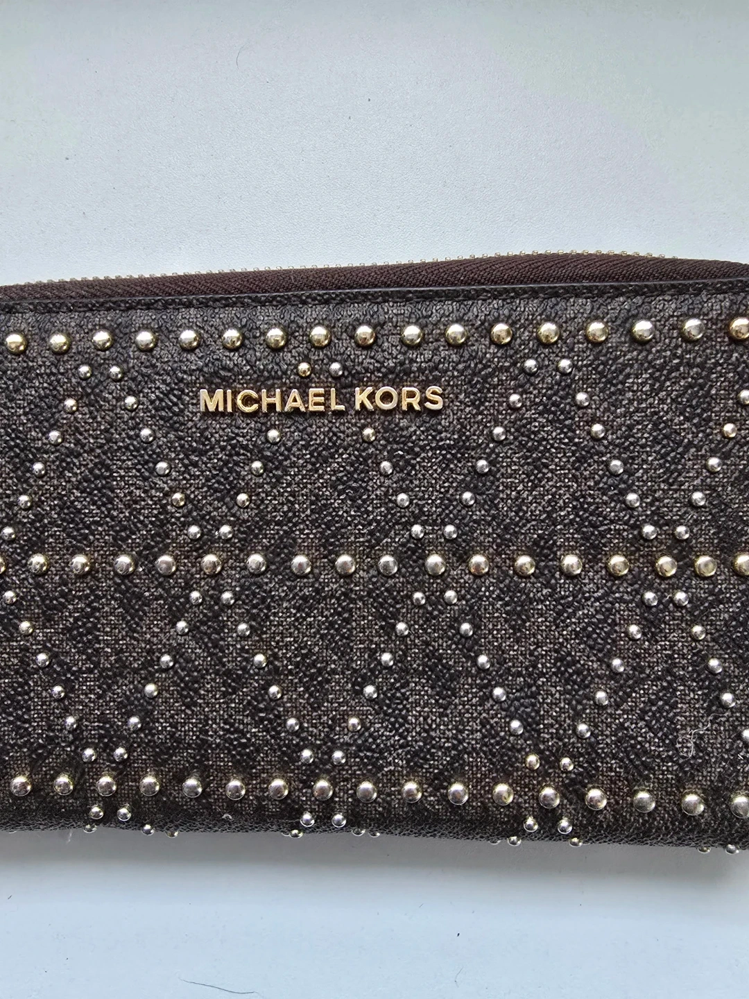 This is a Michael Kors zip-around wallet with a brown logo-print exterior and silver-tone studs. It features a tan interior with multiple card slots and a zip pocket. It's a stylish way to keep your essentials organized!