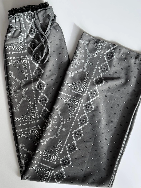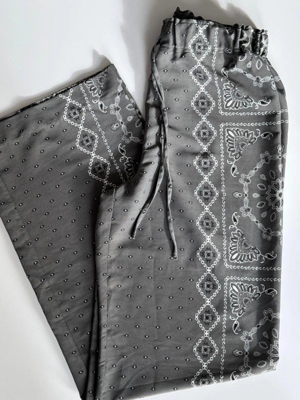 Grey pants with a white bandana print. Drawstring waist. Lightweight fabric. Size small.