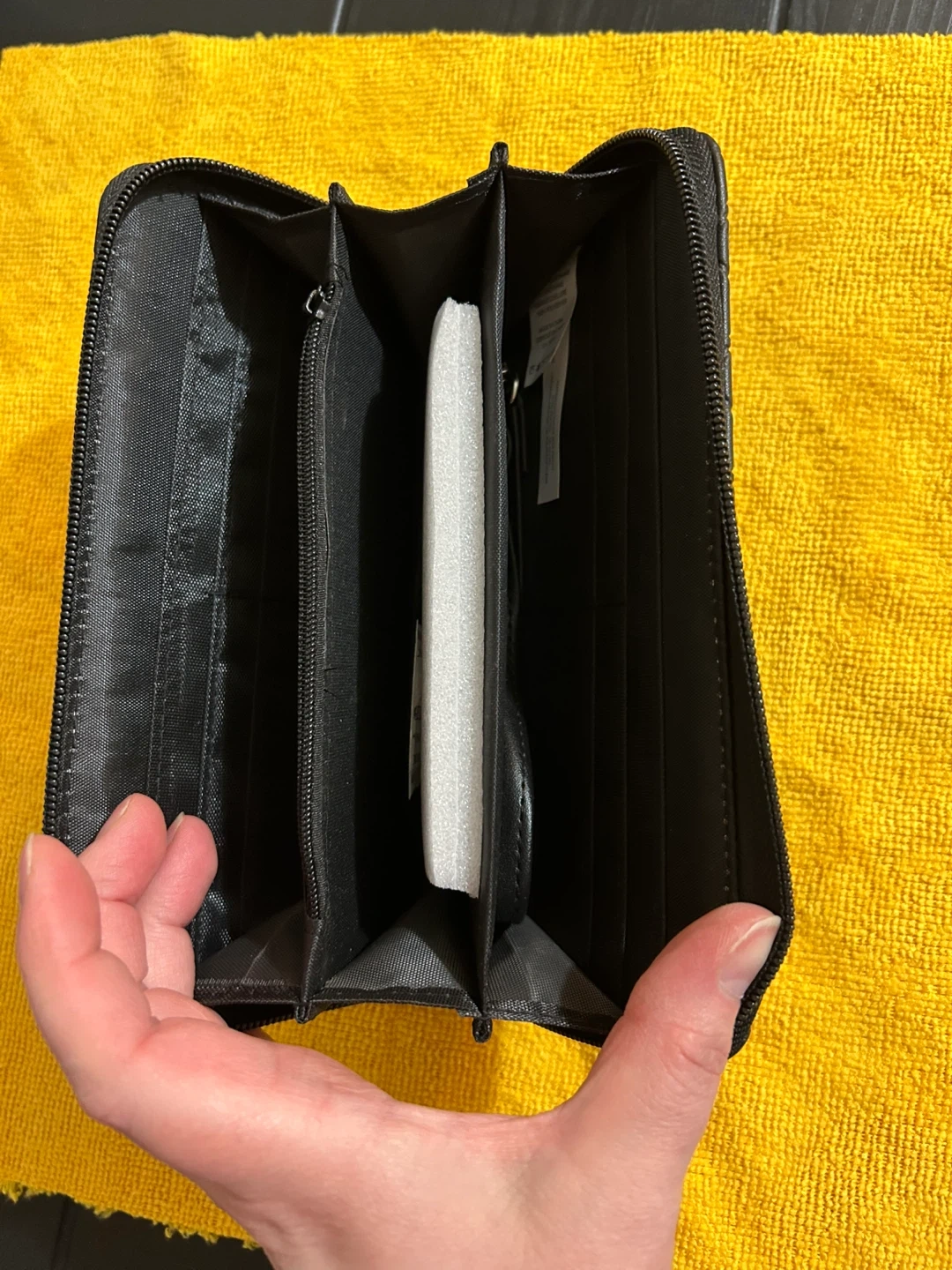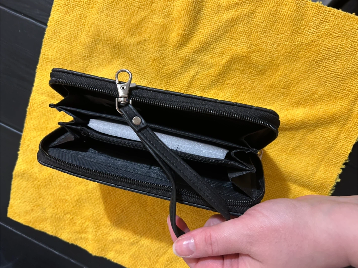 This black clutch wallet has a diamond-patterned exterior and a convenient wrist strap. It features multiple compartments and a zippered coin pocket inside. It's perfect for keeping your essentials organized on the go!