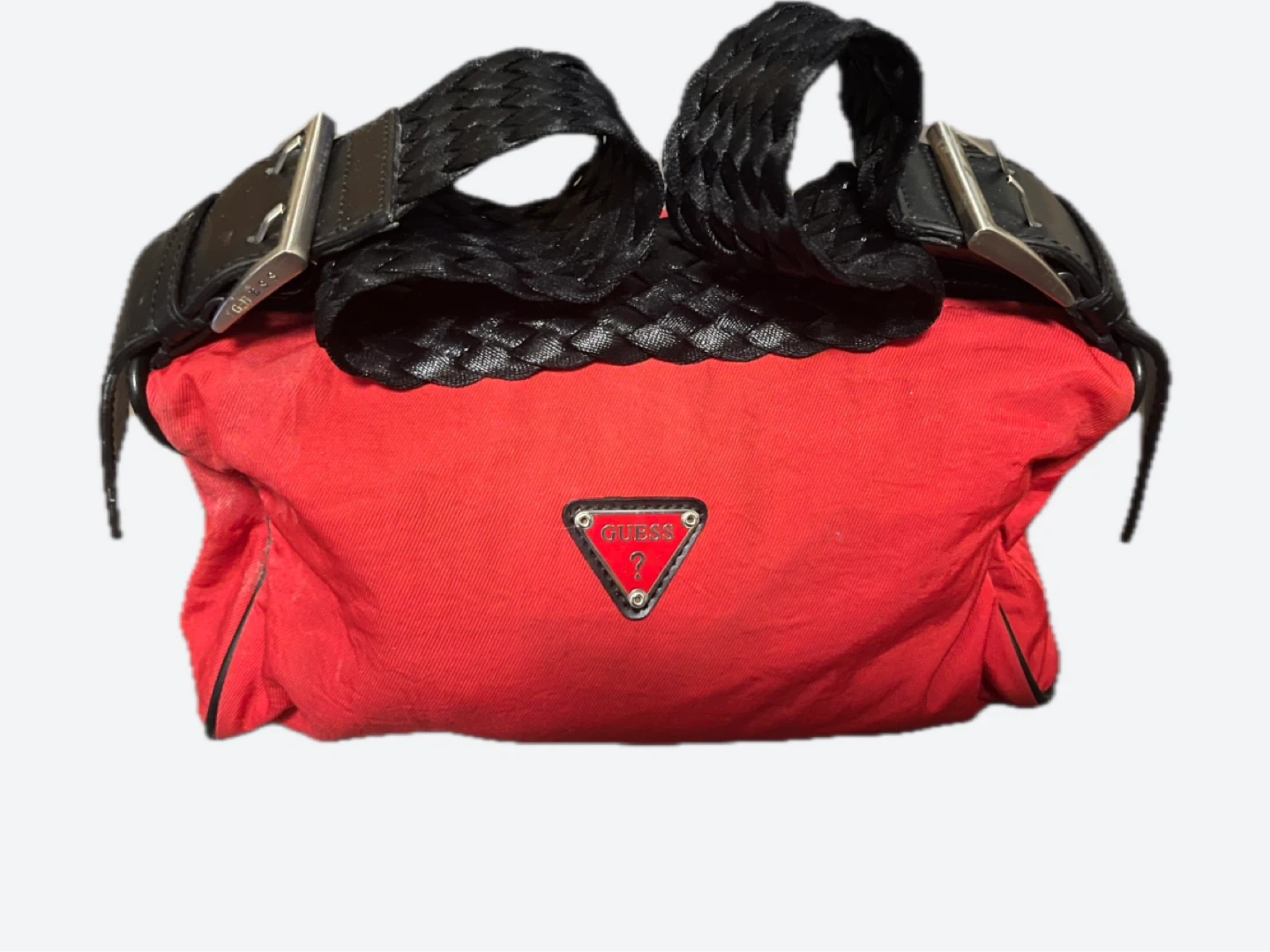 Selling a red Guess shoulder bag. It's in good condition and has a unique design with black braided detailing, buckle straps and one zipped pocket inside. Perfect for adding a pop of colour to your outfit!