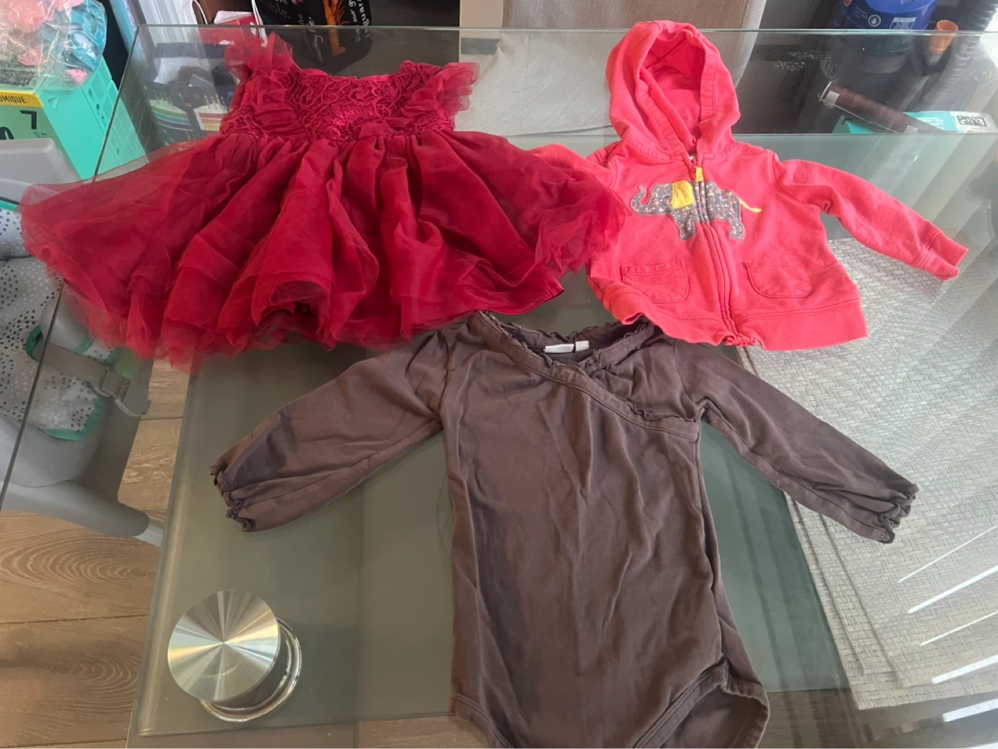 A collection of baby girl's clothing including onesies, dresses, romper, sweater and gown. (Red). Includes various sizes and styles. Many pieces feature cute prints like polka dots, hearts, and Disney characters for 6mos onwards.