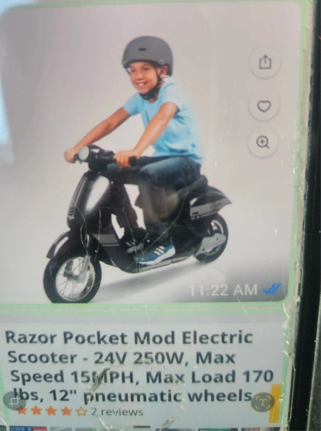 Razor Pocket Mod Electric Scooter - 24V 250W. Max speed 15 MPH, max load 170 lbs. Features 12" pneumatic wheels. It's a fun ride!
