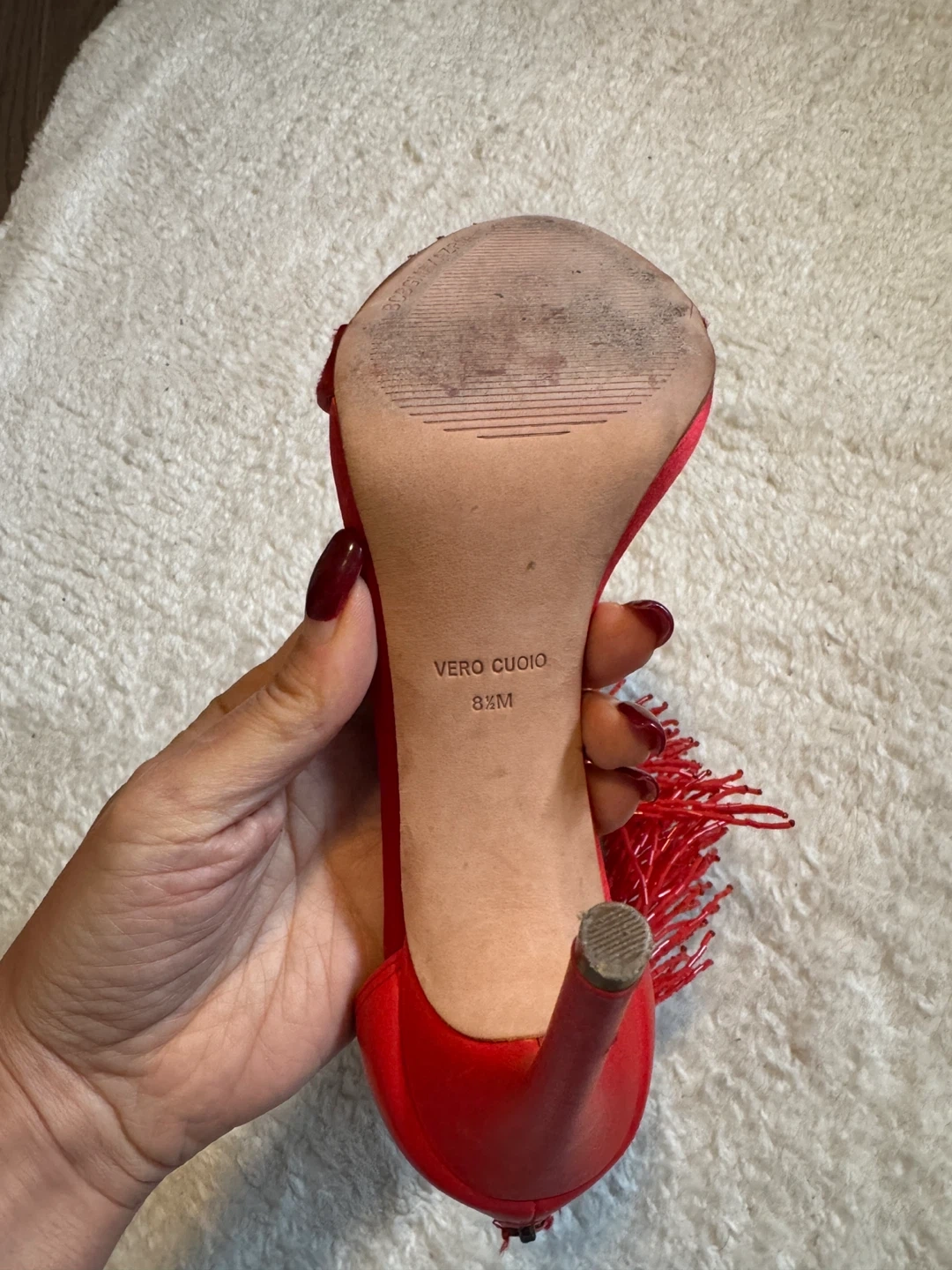 These striking red heels feature a satin finish and decorative fringe detail across the ankle strap. The sole is made of Vero Cuoio. Size is 8.5M. Perfect for adding flair to an evening outfit!