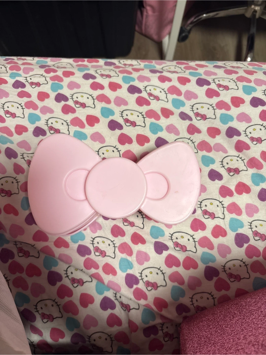 This is a pink, bow-shaped container featuring the iconic Hello Kitty design. It's perfect for storing small trinkets or accessories. The plastic construction makes it durable and easy to clean.