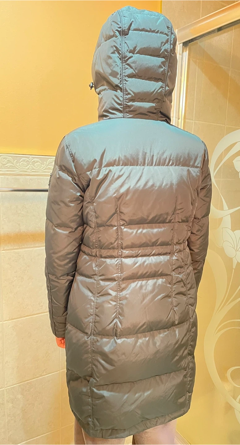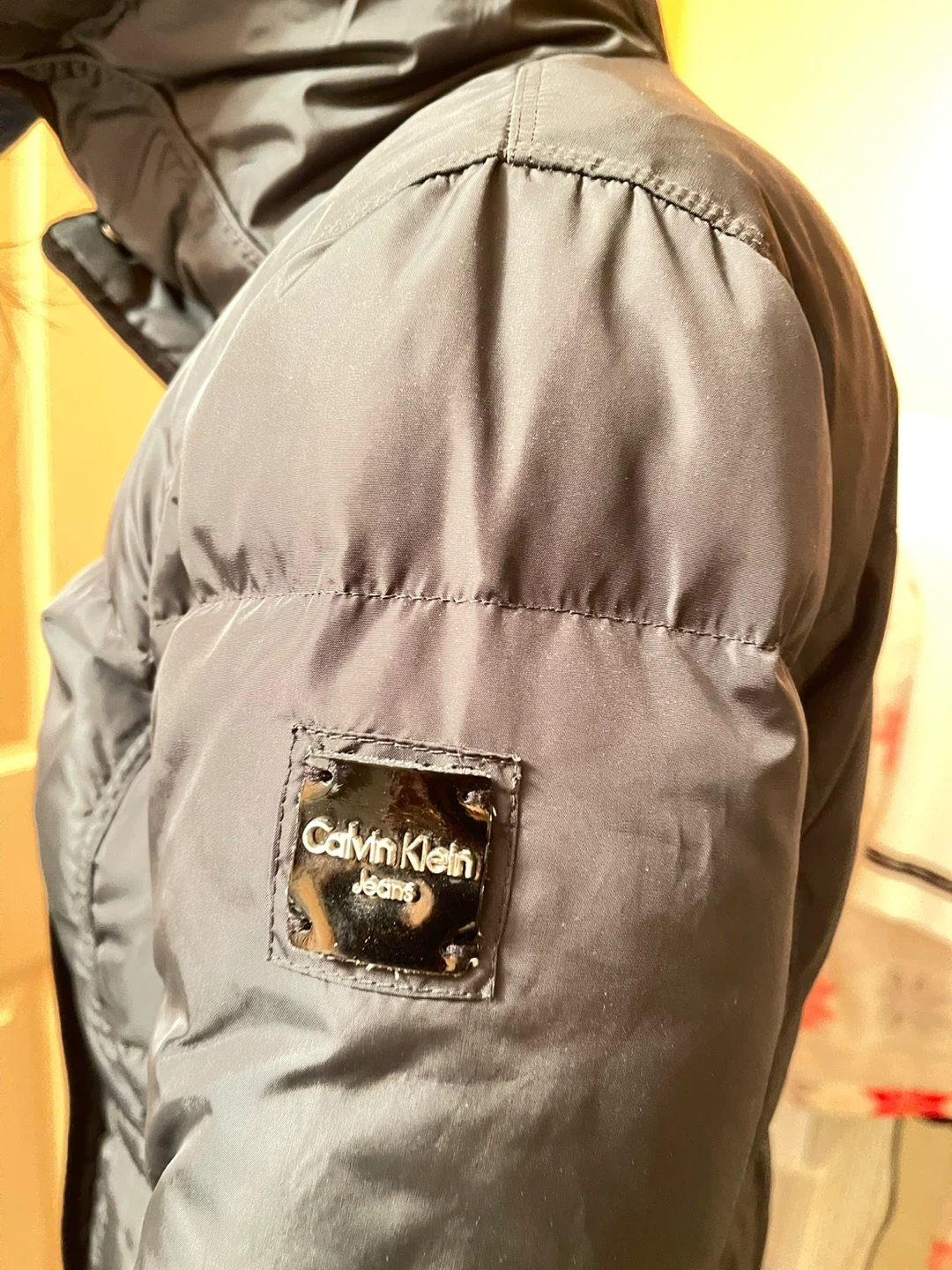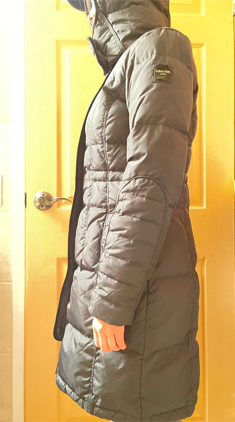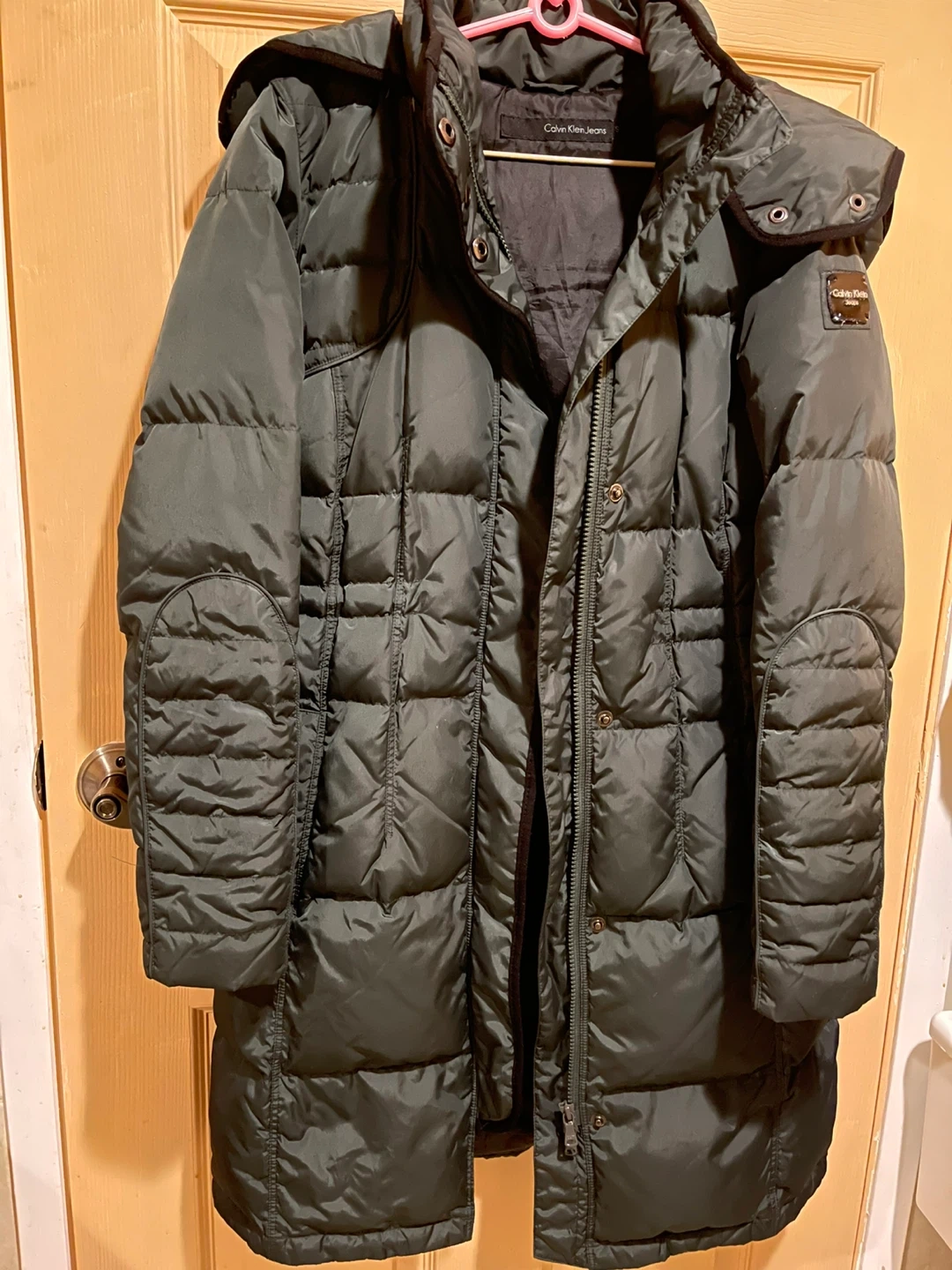 Calvin Klein Jeans puffer coat. It's a dark green, down-filled jacket with a hood. This coat offers excellent warmth for colder weather.