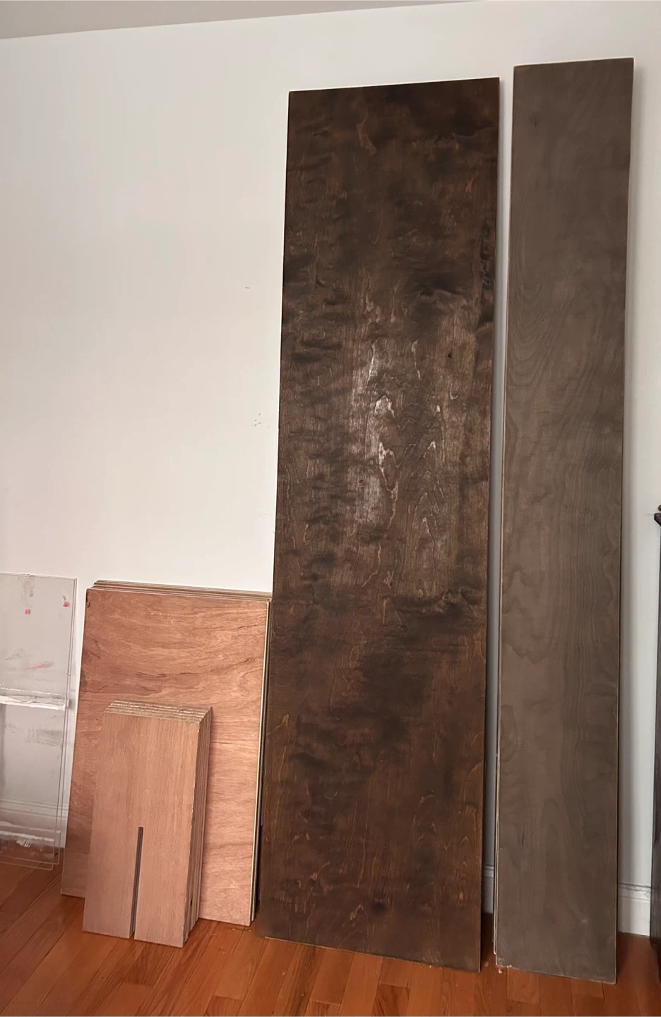 Collection of plywood sheets in various sizes and finishes. Includes natural birch wood grain, dark stained, and gray stained pieces. Suitable for DIY projects, furniture makers, crafting, woodwork, art students, etc