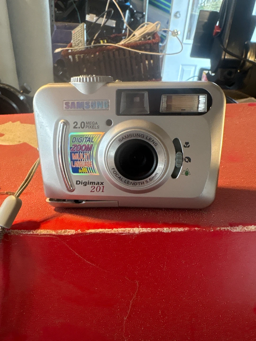Samsung Digimax 201 digital camera with 2.0 megapixels. It features a Samsung lens with a 5.6mm focal length. This camera is silver in colour.