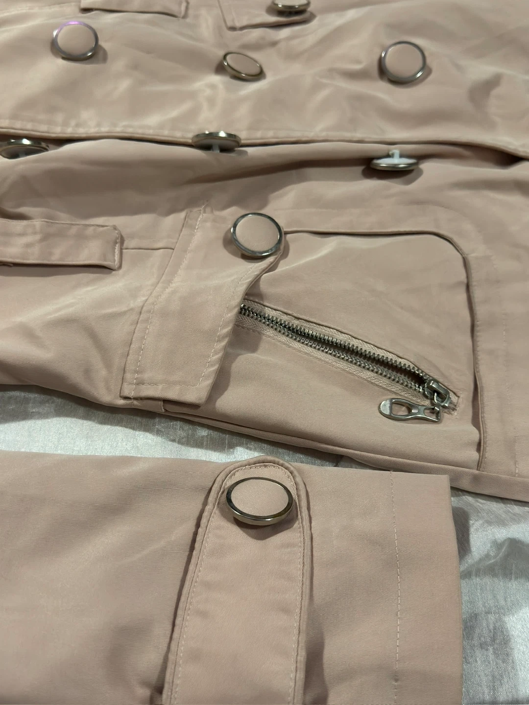 A stylish light pink hooded trench coat, perfect for those cooler days! It features a double-breasted button closure and a unique patterned lining. This coat is in great condition and ready for a new owner!
