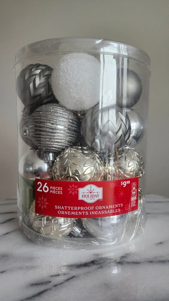Set of 26 shatterproof Christmas ornaments in various silver and gold designs. Ornaments are packaged in a clear plastic container.