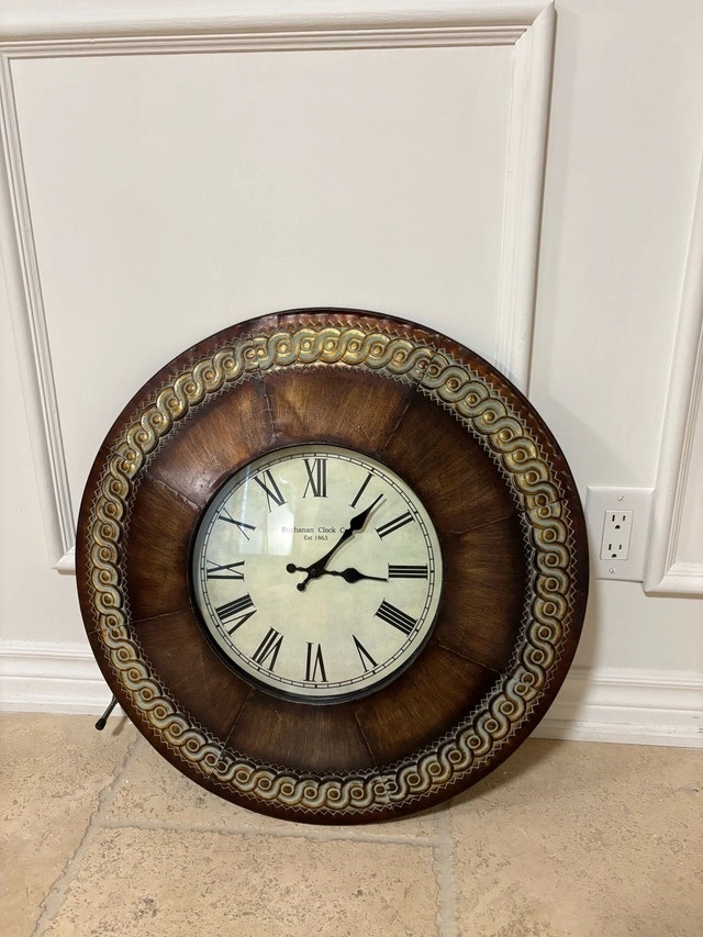 Used Bohemian Clock Co. decorative wall clock, perfect for adding a touch of vintage charm to your home. Features a distressed bronze-tone finish and classic Roman numerals. It has a quartz movement for accurate timekeeping. In good condition with some minor wear consistent with its age. Brand: Bohemian Clock Co. Style: Vintage/Classic Material: Metal Power Source: Battery (AA). Asking $80. If the ad's still up, the clock's still available!
