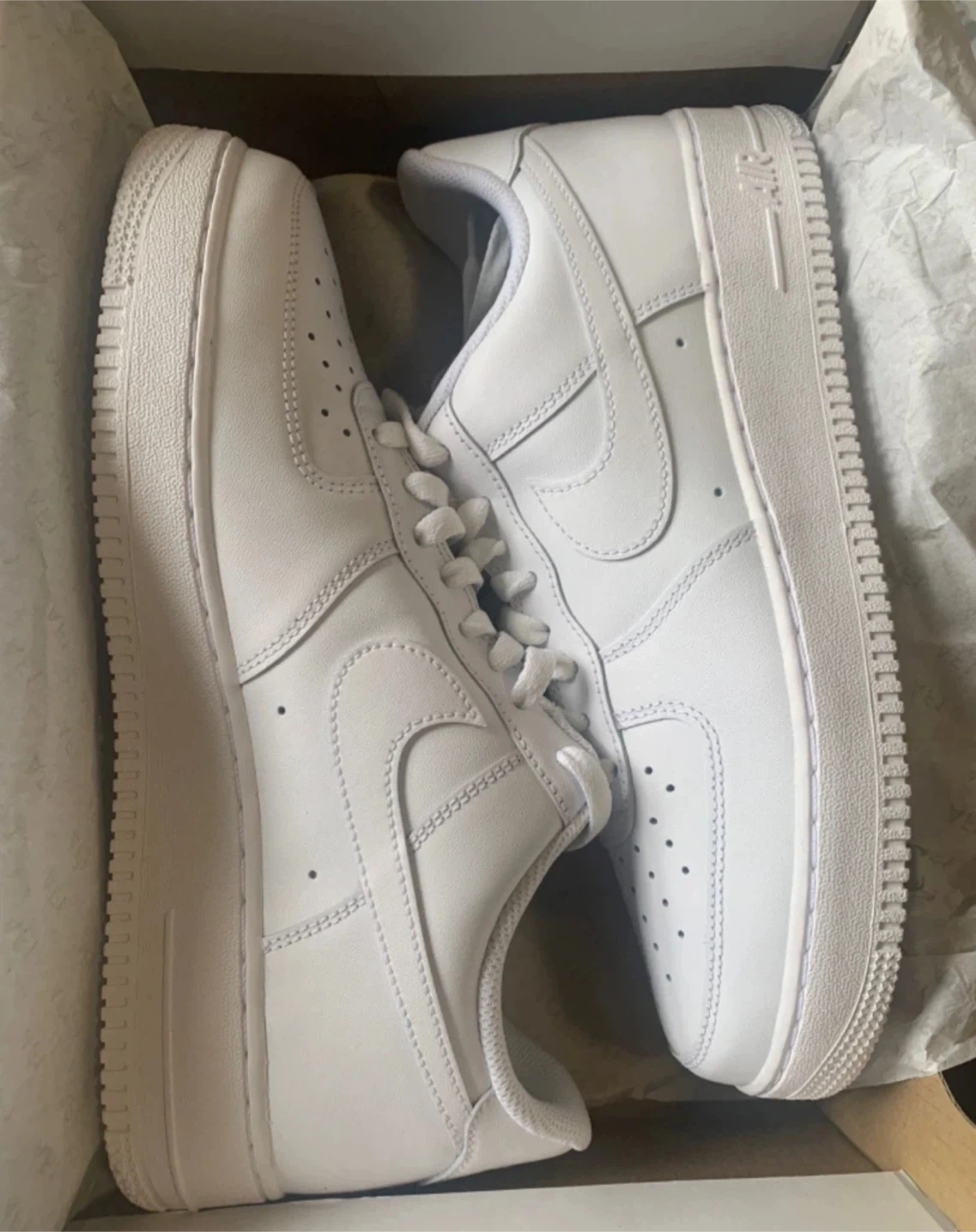 Classic Nike Air Force 1 Low sneakers in white. Men's size 10.5. These iconic kicks are made of leather with a durable rubber sole. They come in their original box.Also available in sizes 8.5,9,9.5,10,10.5,11&12