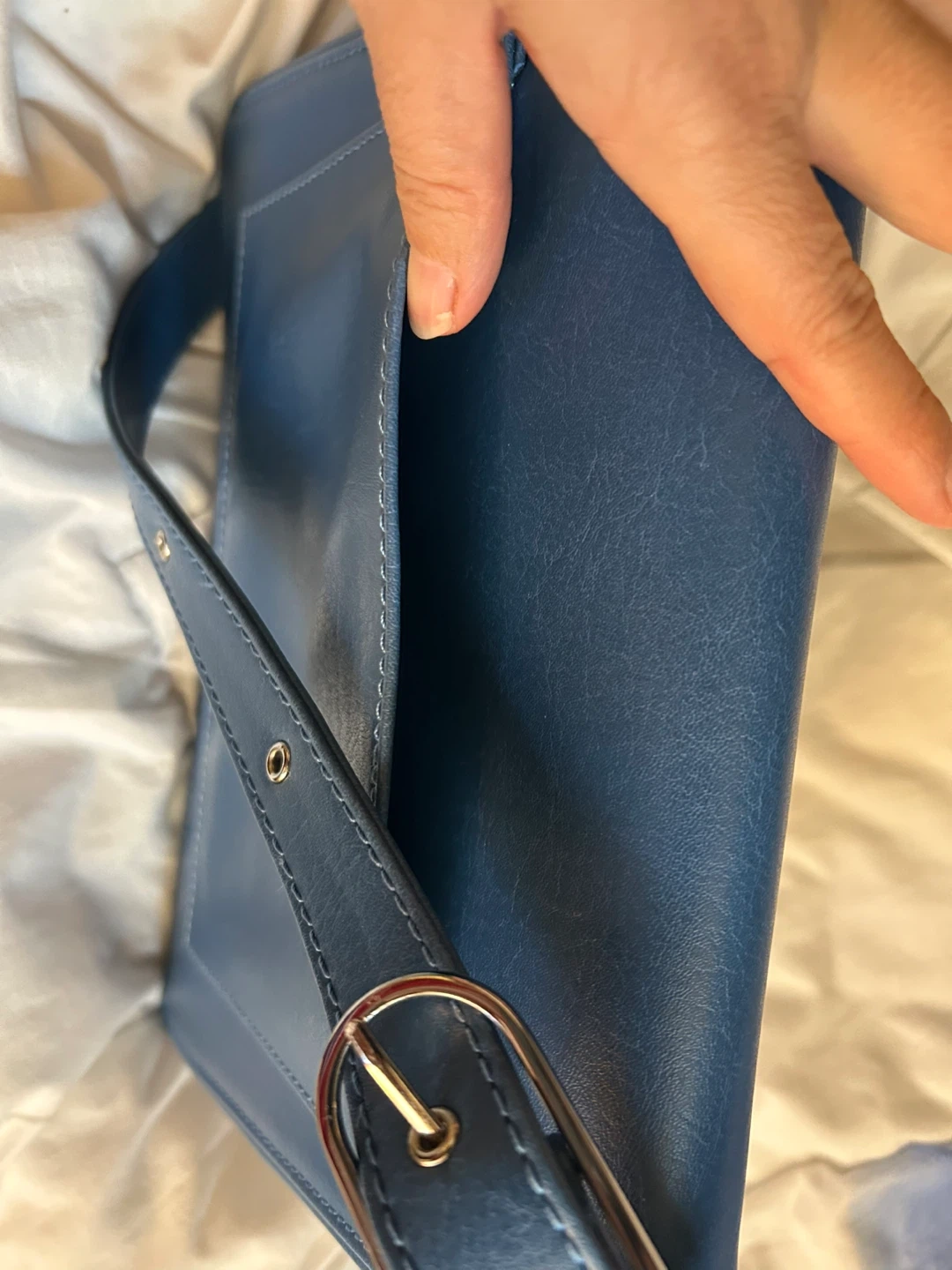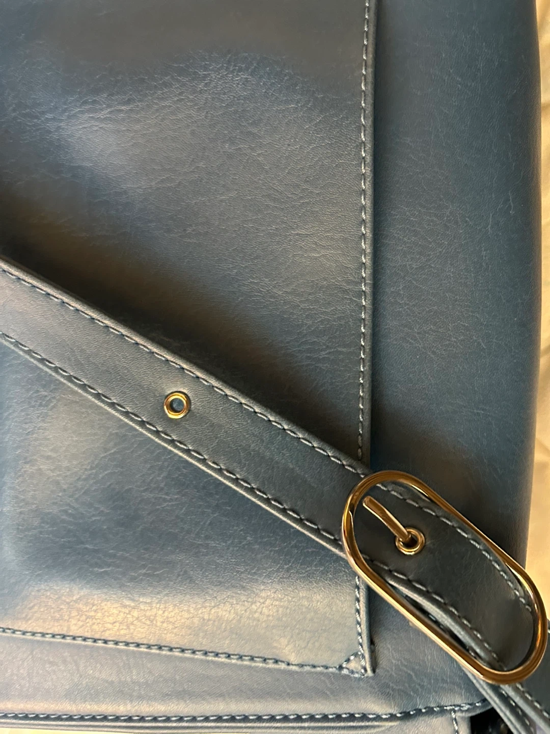 Matt & Nat crossbody bag in a lovely blue colour. Made with vegan leather. Features a magnetic snap closure and adjustable strap.