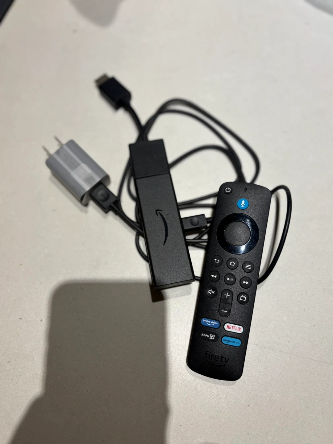 This is an Amazon Fire TV Stick and its remote. It also includes the power adapter and cable. It's great for streaming your favourite shows and movies.