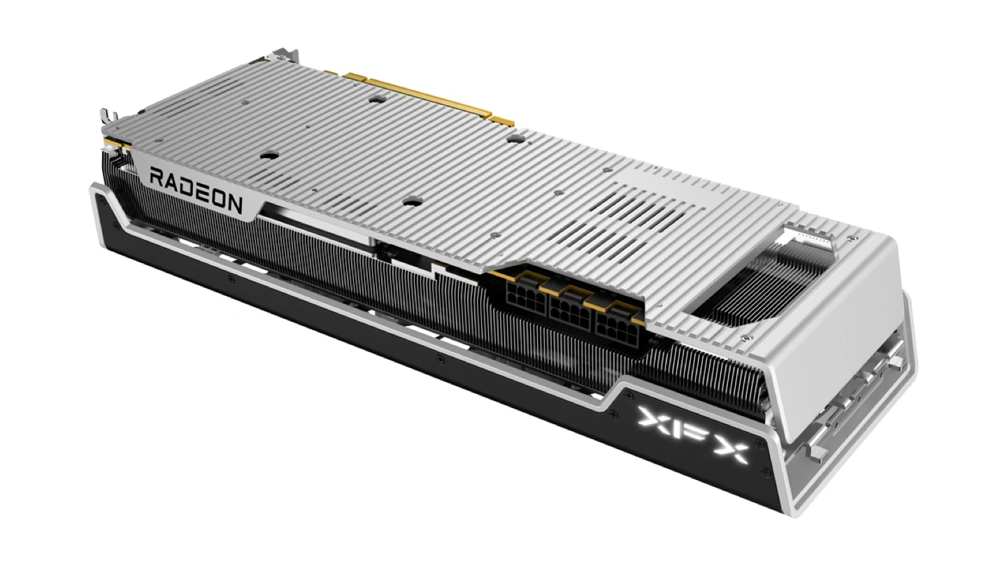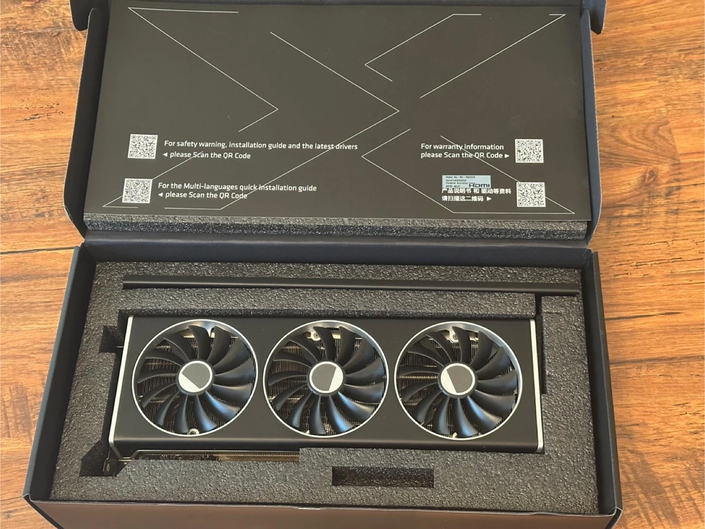This XFX Radeon RX graphics card features three cooling fans for optimal performance. It comes in its original box with protective foam. The card is black with a silver and white shroud. Includes installation guides and warranty information accessible via QR codes.