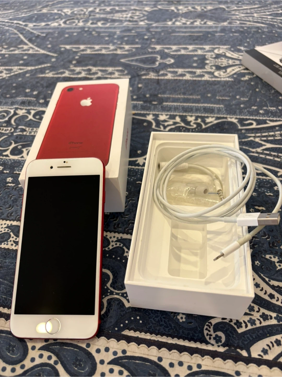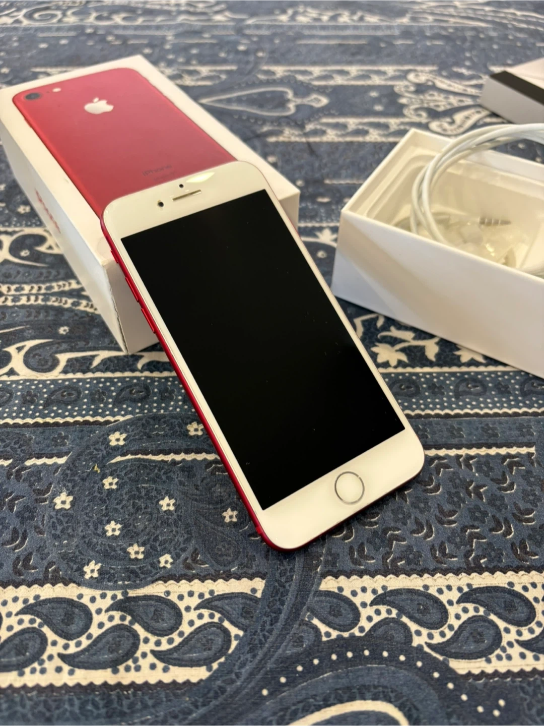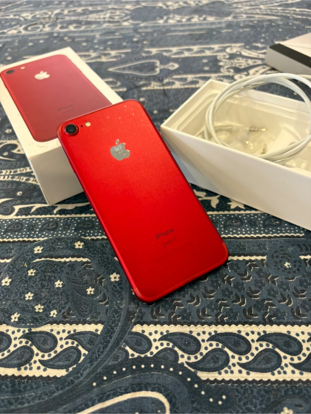 This is an Apple iPhone 7 128GB(PRODUCT)RED. It comes with the original box and EarPods with Lightning Connector. Includes USB cable too.
