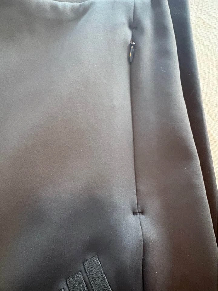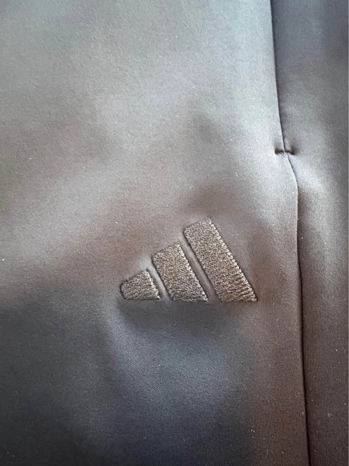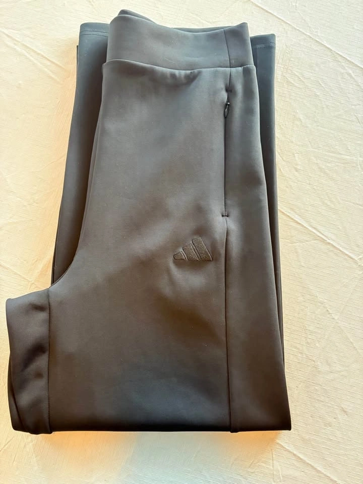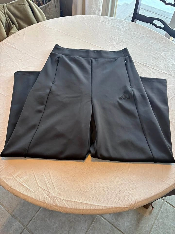 Stylish black Adidas pants! Women's size Medium (8-10). High-rise waistband for a secure, flattering fit. Ankle-length (7/8 length), hits just above shoe. Two secure side-zip pockets for phone or keys. Soft-touch, stretchy performance fabric. Moisture-wicking too. Subtle tonal Adidas logo on upper thigh. Pick up Fergus.