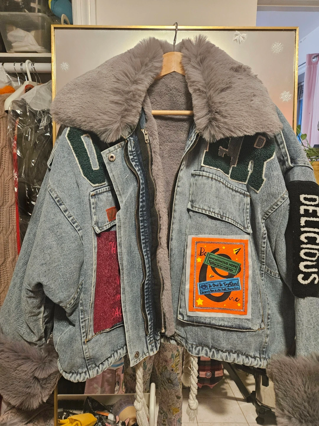 Stylish denim jacket featuring a removable faux fur collar and cuffs. It's lined for extra warmth and has a zip-up front closure. Unique patches and "DELICIOUS" text detail on the sleeve add a touch of personality. A cool outerwear piece for any season!