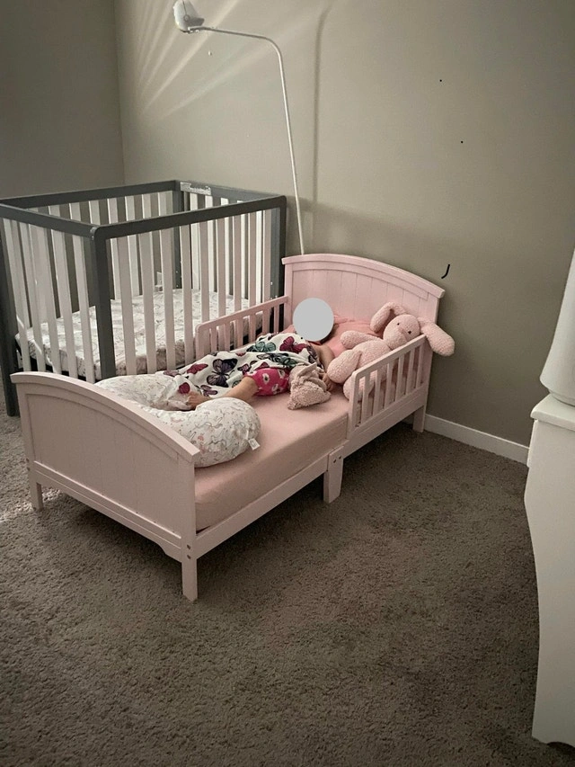 This adorable toddler bed is perfect for transitioning your little one from a crib. It's in used condition but still has lots of life left for sweet dreams. The bed is sturdy and ready to use. The mattress was used with a protector and nighttime diapers. No moisture reached the mattress pad. This pink toddler bed is ready for a new home! If the ad is up, it's available, so don't hesitate to reach out!