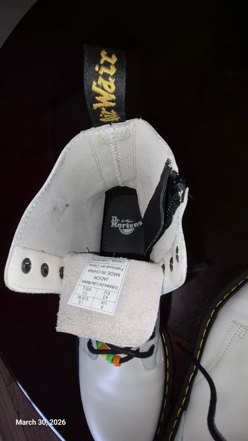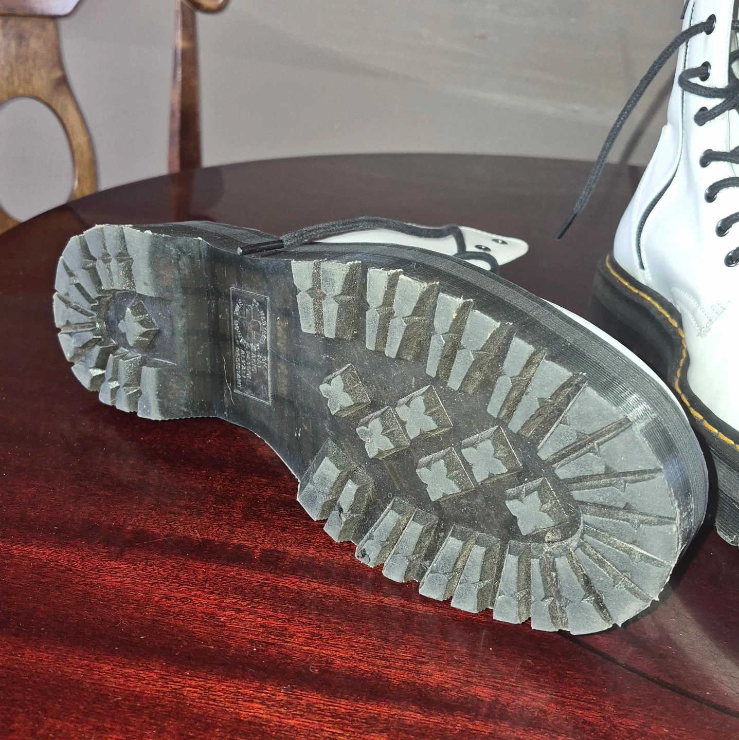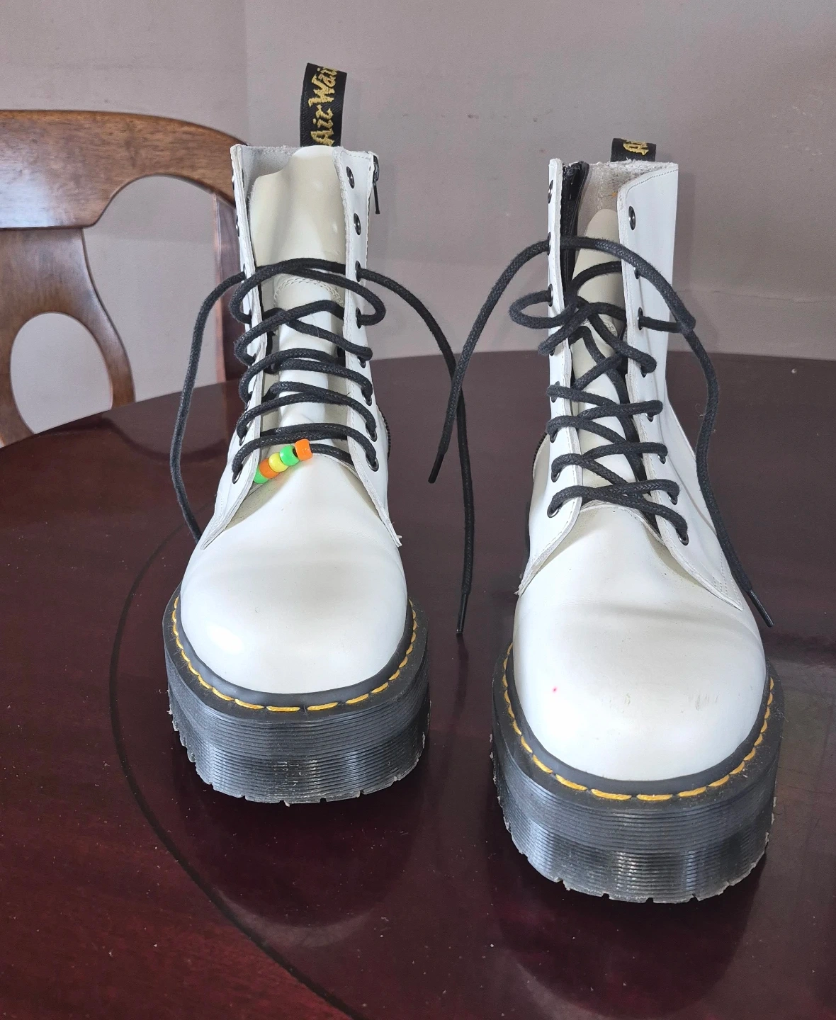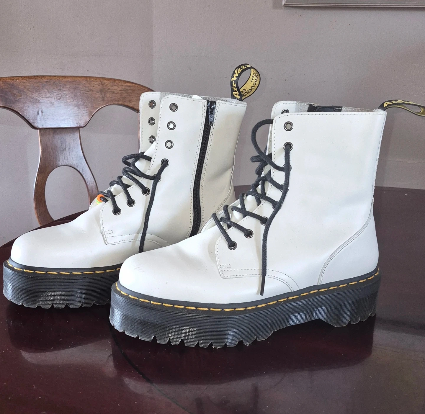 đ„Dr. Martens Jadon white platform boots featuring zippers on the sides for easy on and off.