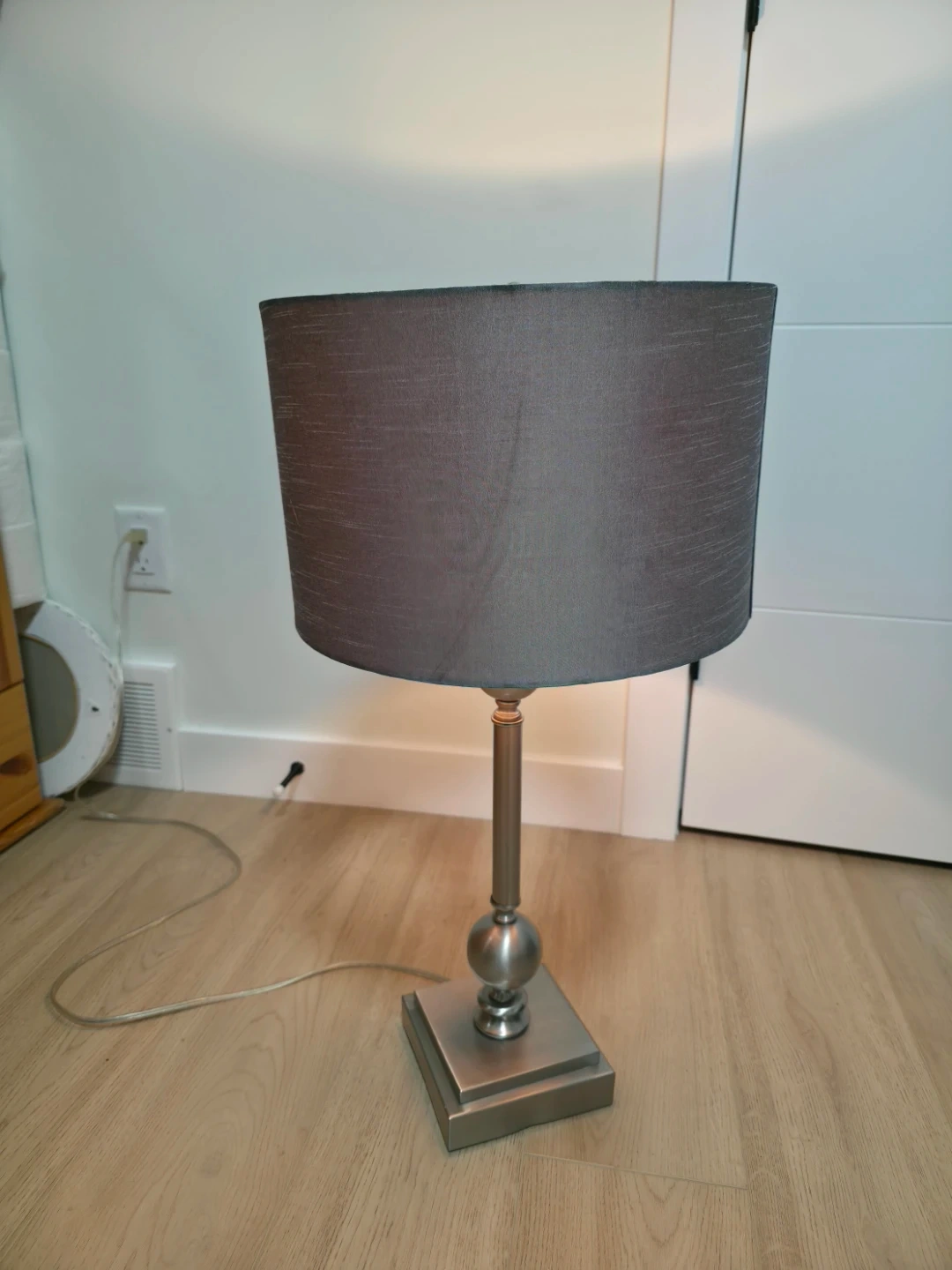 A stylish table lamp with a gray fabric shade and a sleek silver base. It would look great in a living room or bedroom! The lamp provides a warm and inviting light