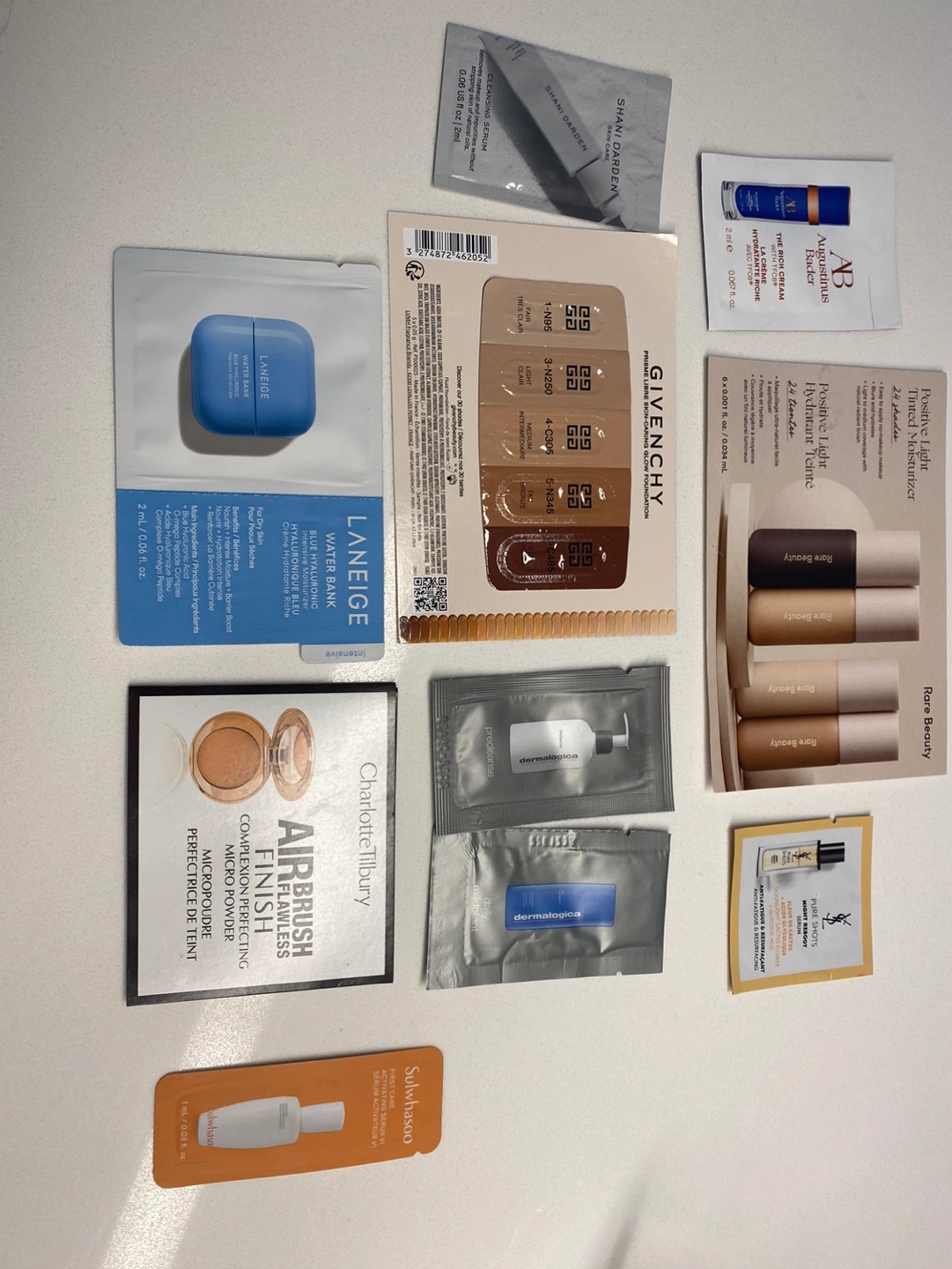 Collection of beauty product samples. Includes foundations, serums, moisturizers, and powder. Brands featured: Rare Beauty, Givenchy, Laneige, Augustinus Bader, Charlotte Tilbury, Shani Darden, Sulwhasoo, and Dermalogica.