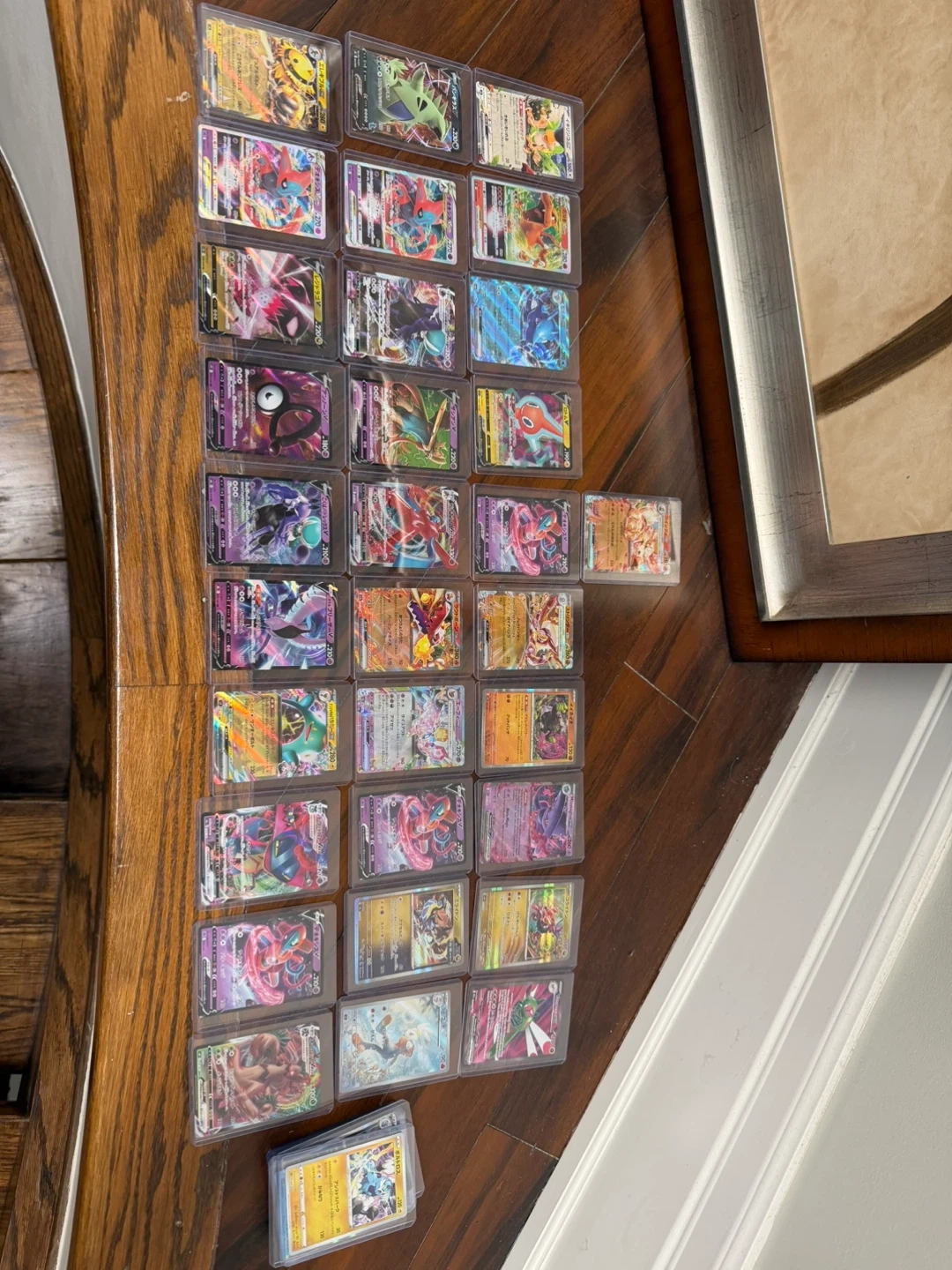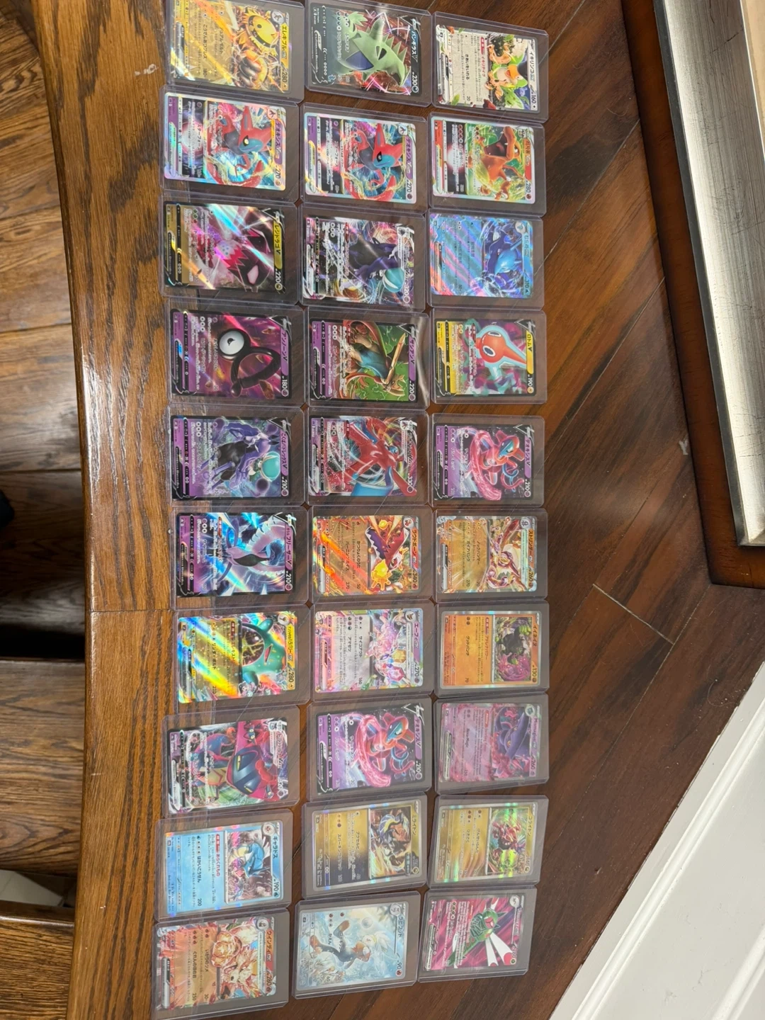 Collection of various Pokémon trading cards. Cards are housed in protective sleeves. Includes several holographic and rare cards. Great for collectors! mainly japanese and korean cards some english.