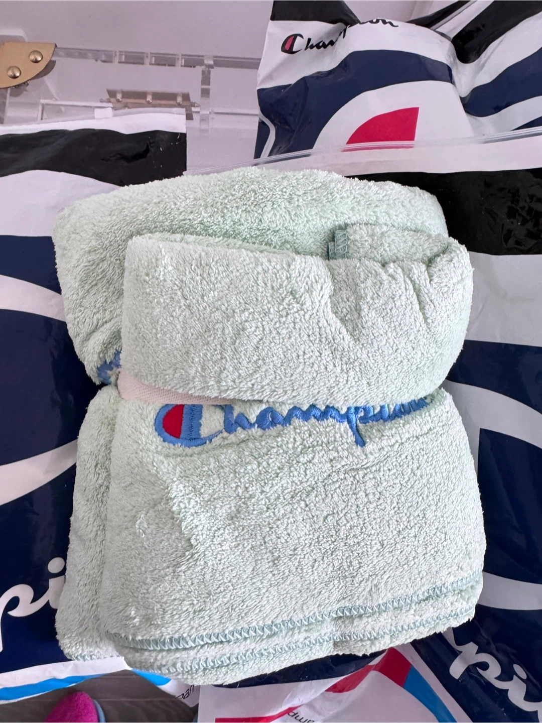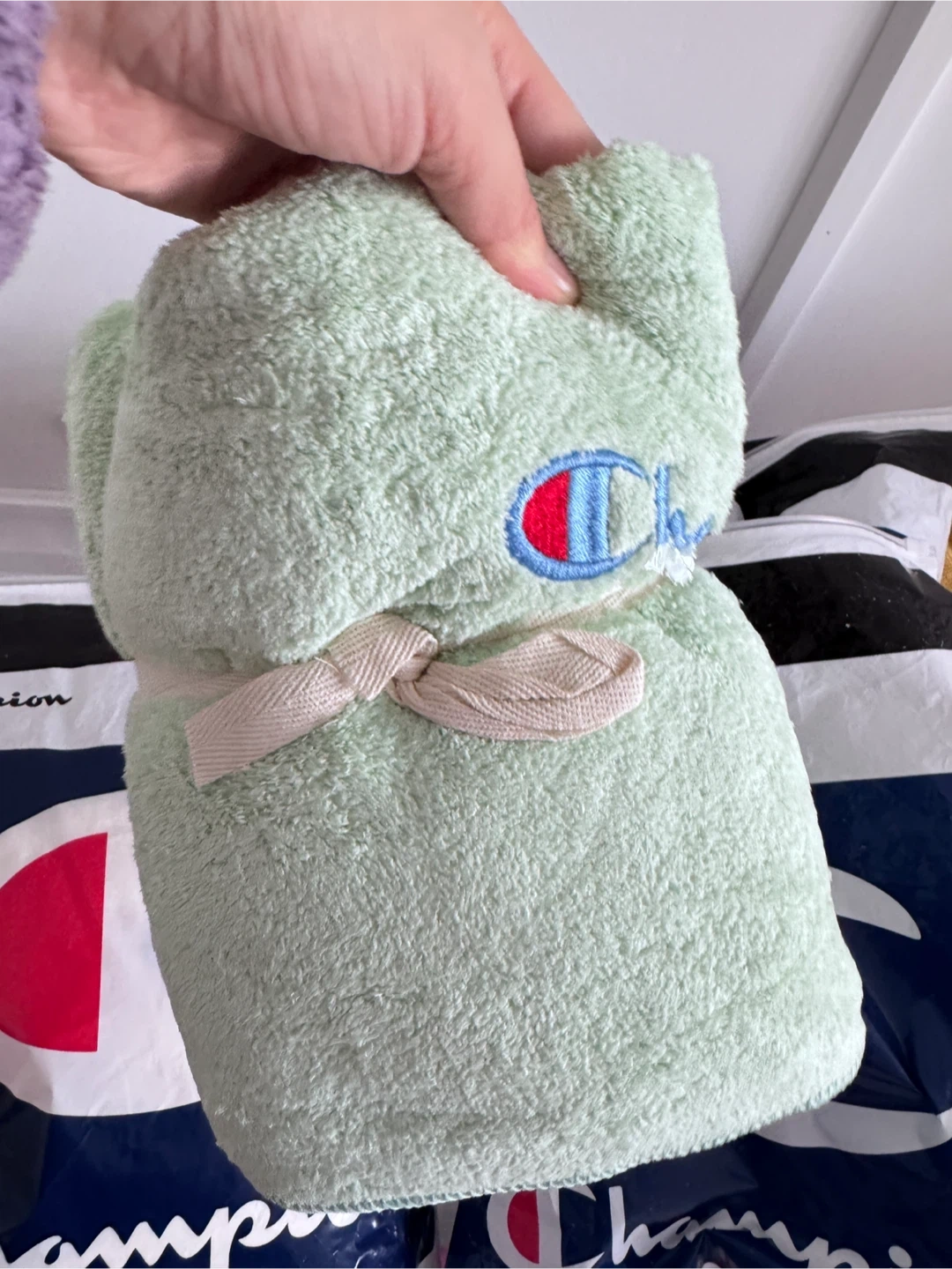 Here are some Champion towel sets in a lovely light green colour and creamy white colour! They are brand new and ready for a new home in your bathroom or gym bag.
