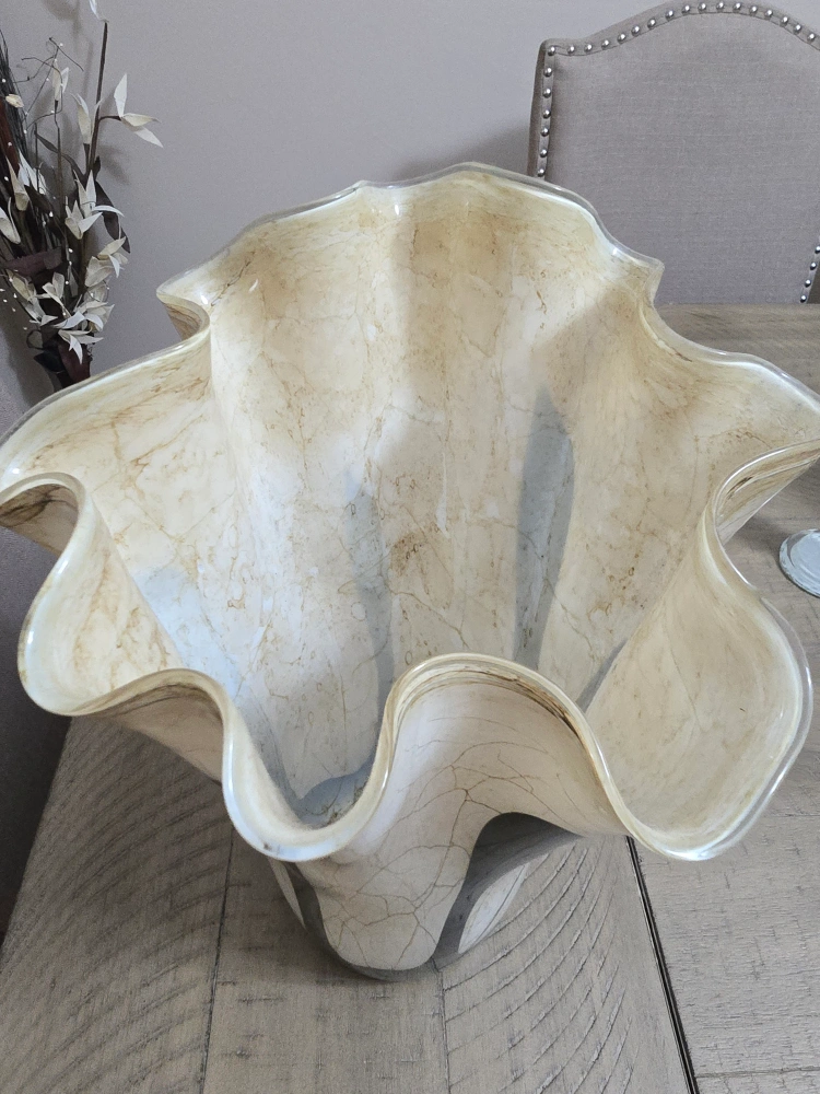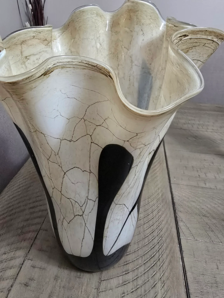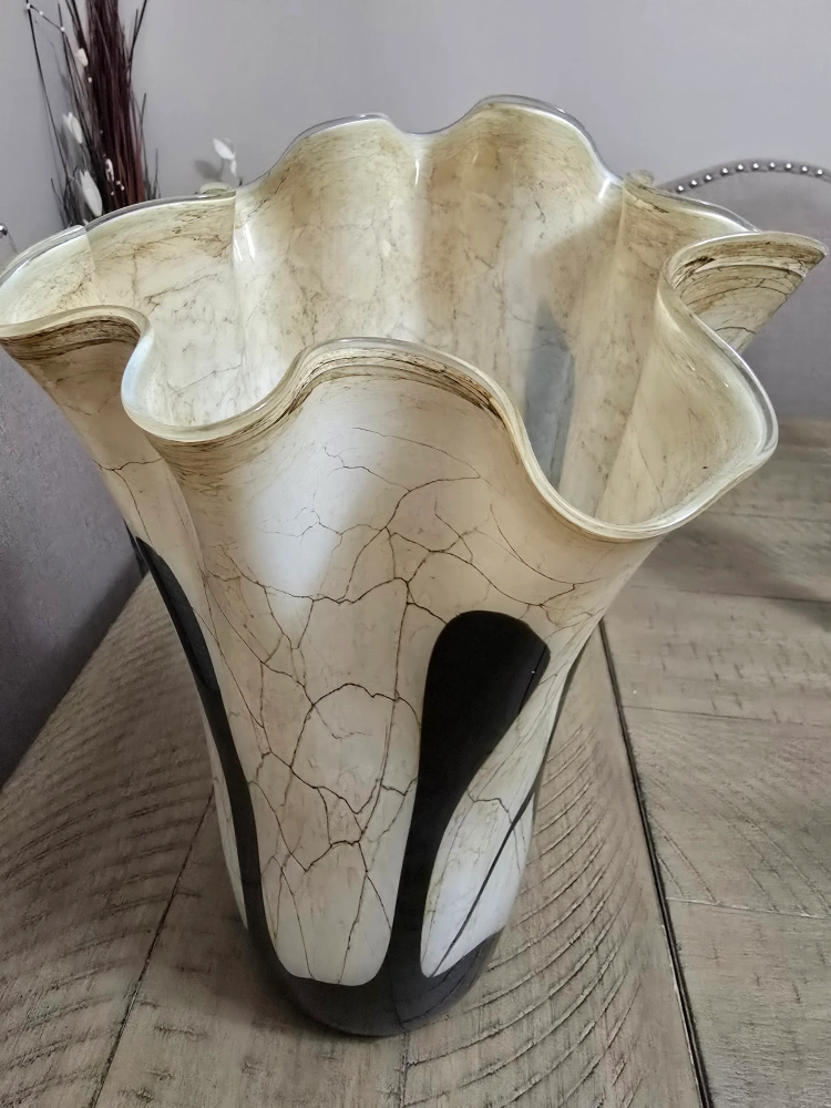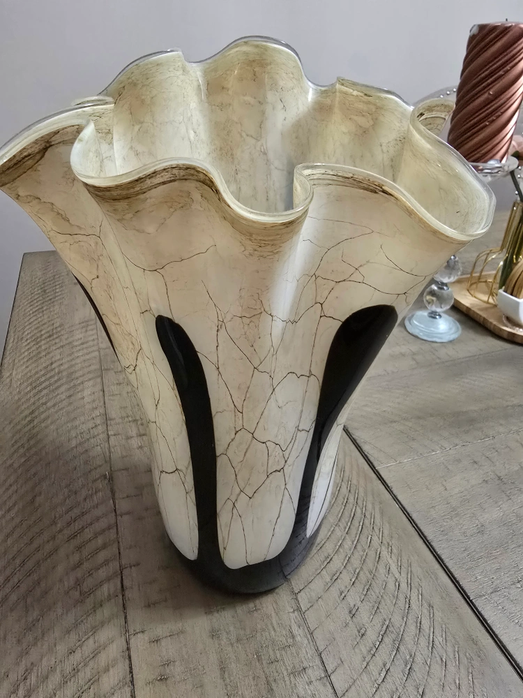 Unique glass vase. Cream coloured body with black accents. Features a ruffled top. Elegant centrepiece for any home.