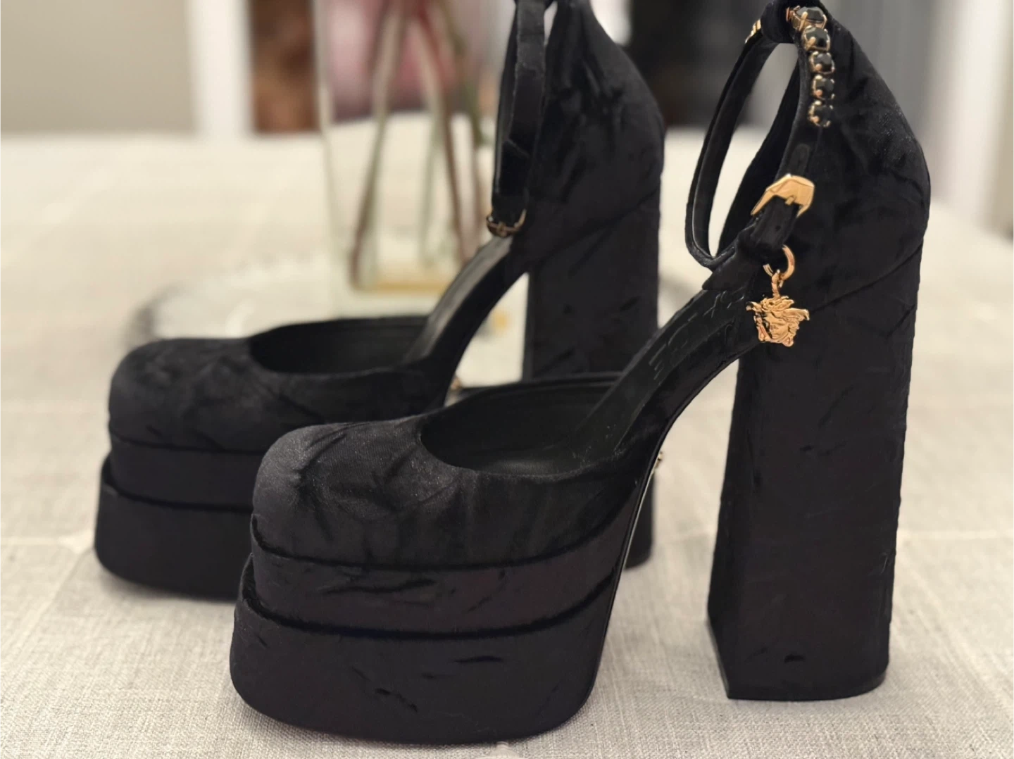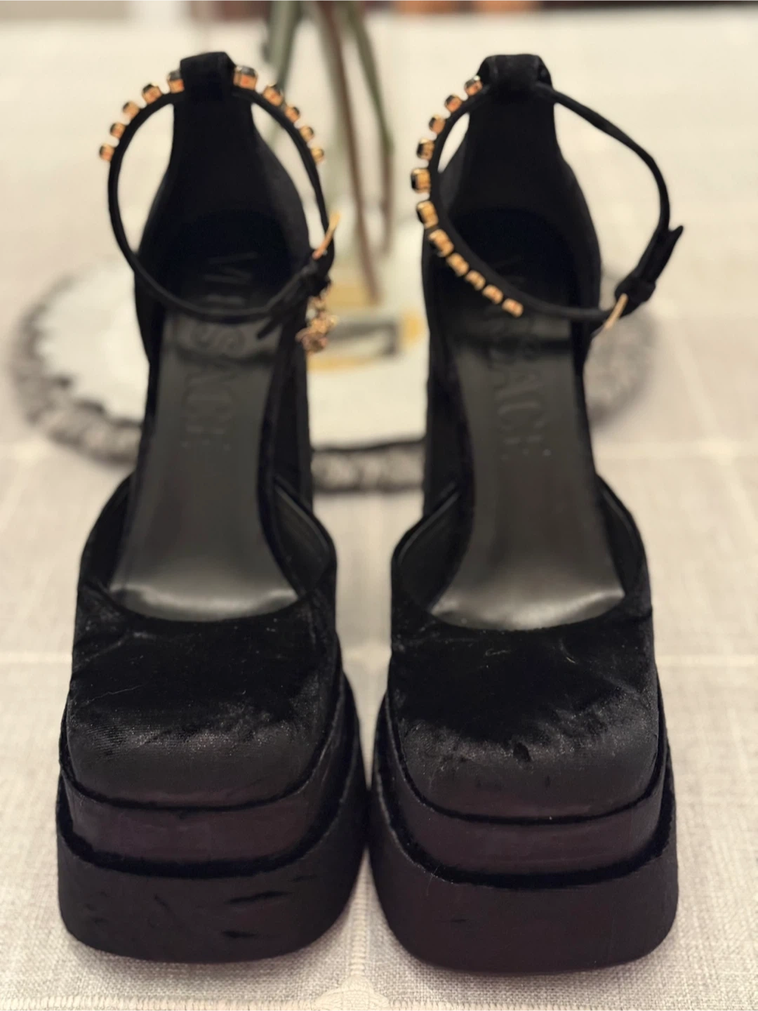 These striking black velvet platform heels are from Versace. They feature a chunky block heel and a delicate ankle strap adorned with crystals and the iconic Medusa charm. These shoes offer both statement style and elevated height!