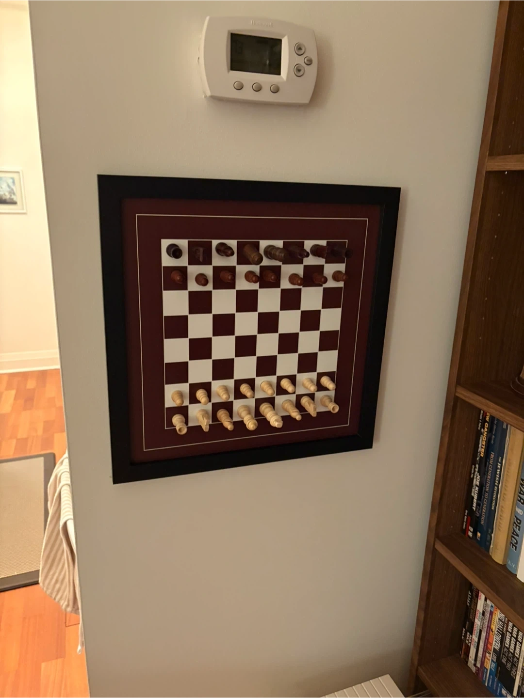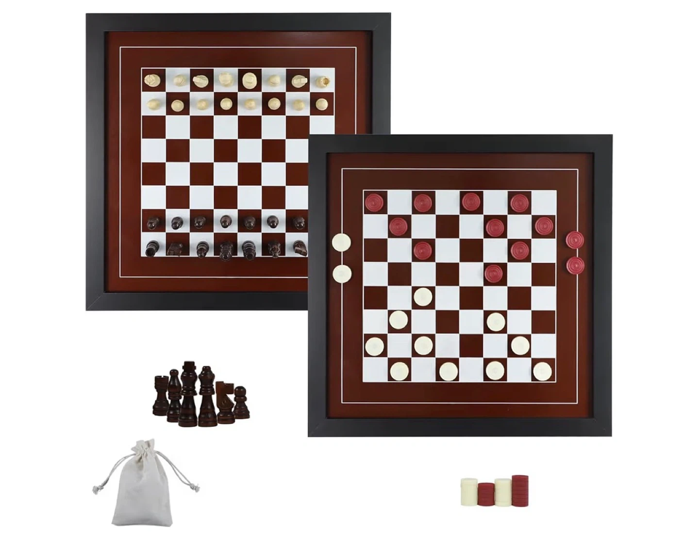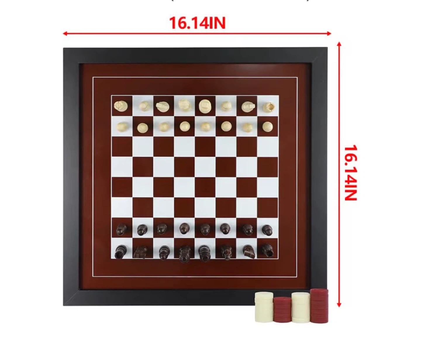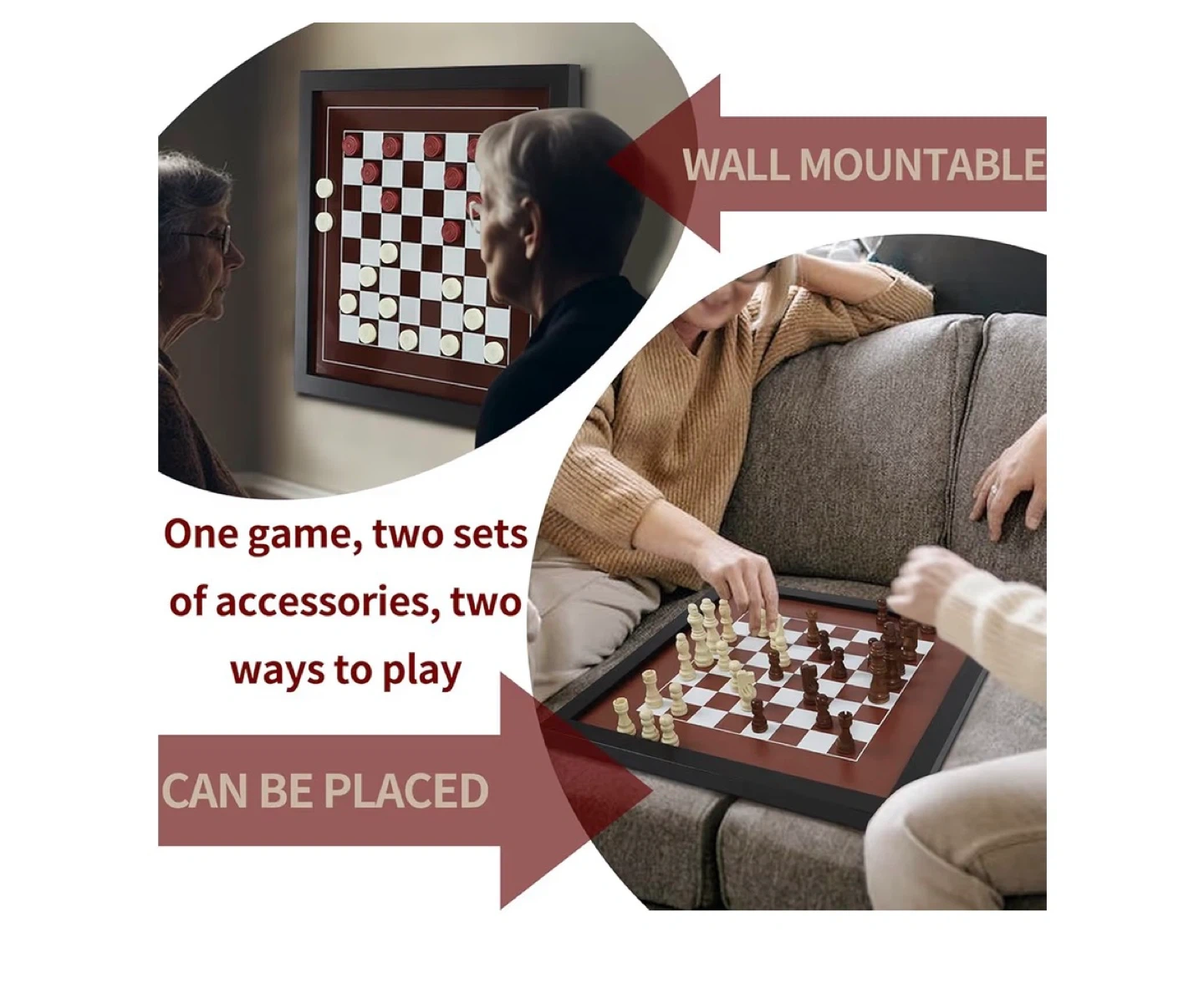 Keywords: wall mounted chess board, magnetic chess set, checkers board, wooden chess set, wall decor game, strategy games, 2 in 1 board game, home decor games, chess and checkers set, hanging game board, modern game room decor
