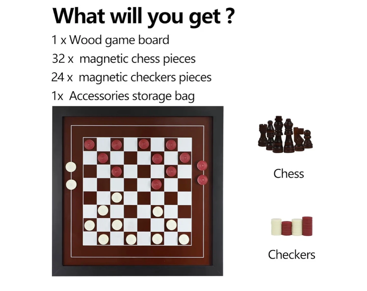 Includes both chess and checkers pieces, with a magnetic board that keeps everything securely in place whether you’re playing on a table or mounted on the wall. Easily switch between games for endless entertainment with family and friends.