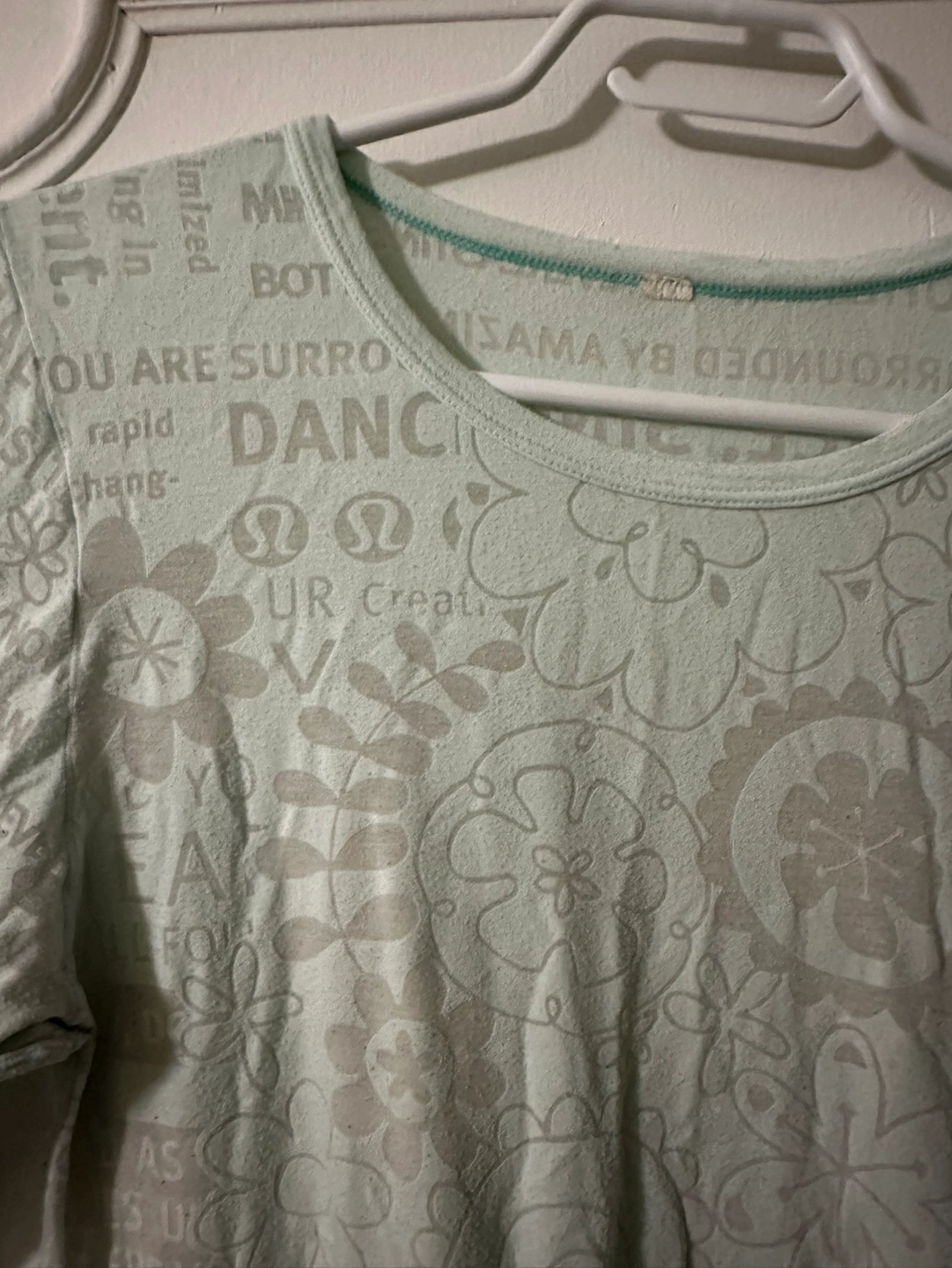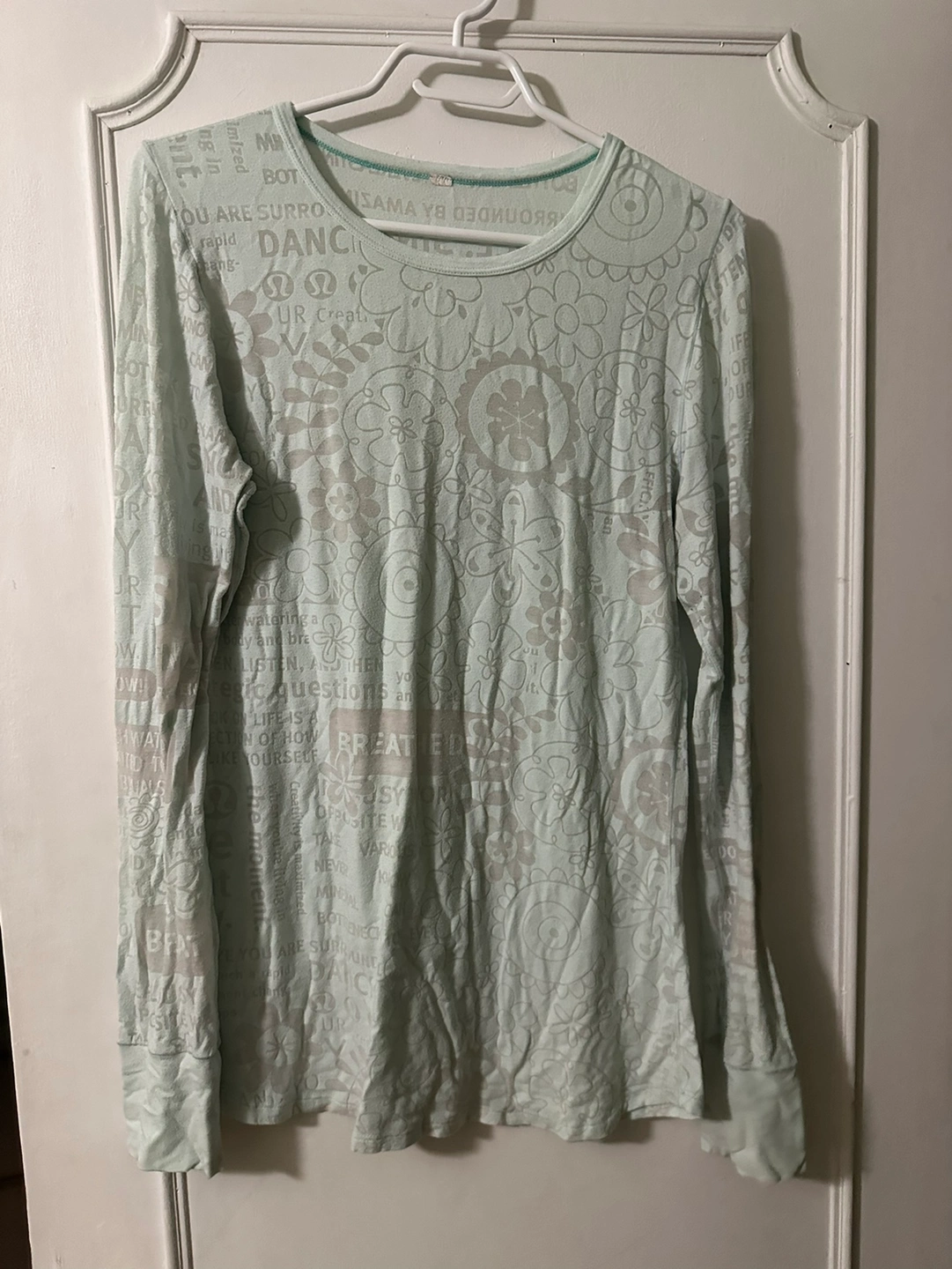 Mint green long sleeve shirt with a floral pattern and text print. Size medium, high stretch