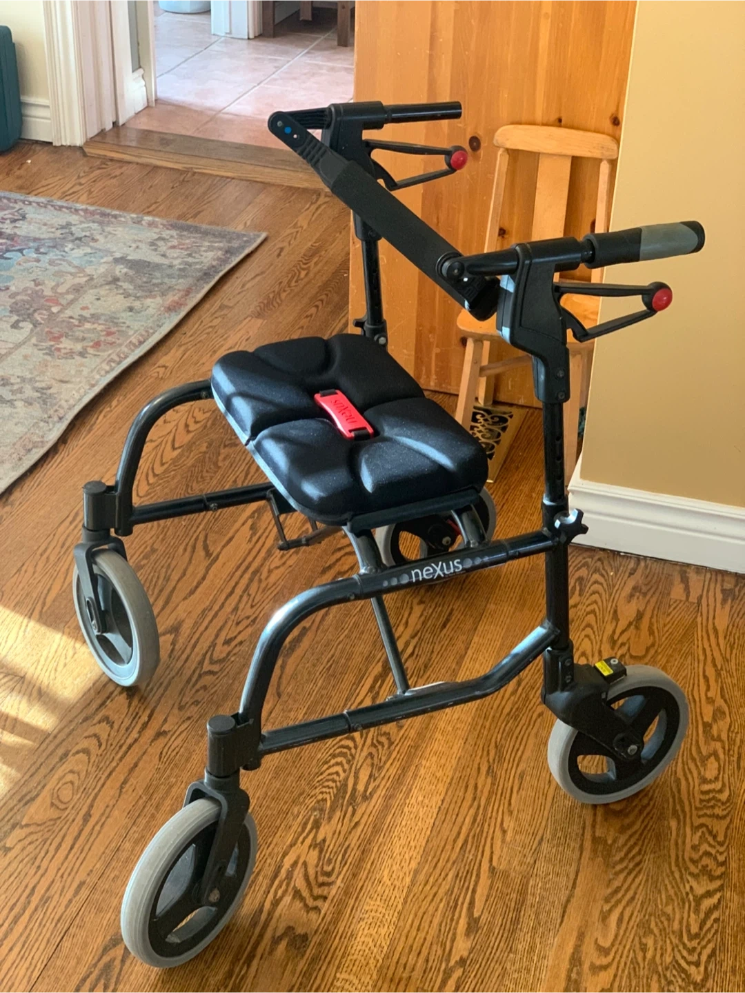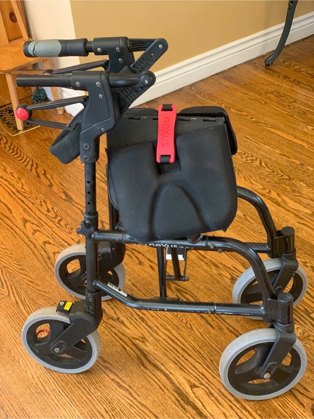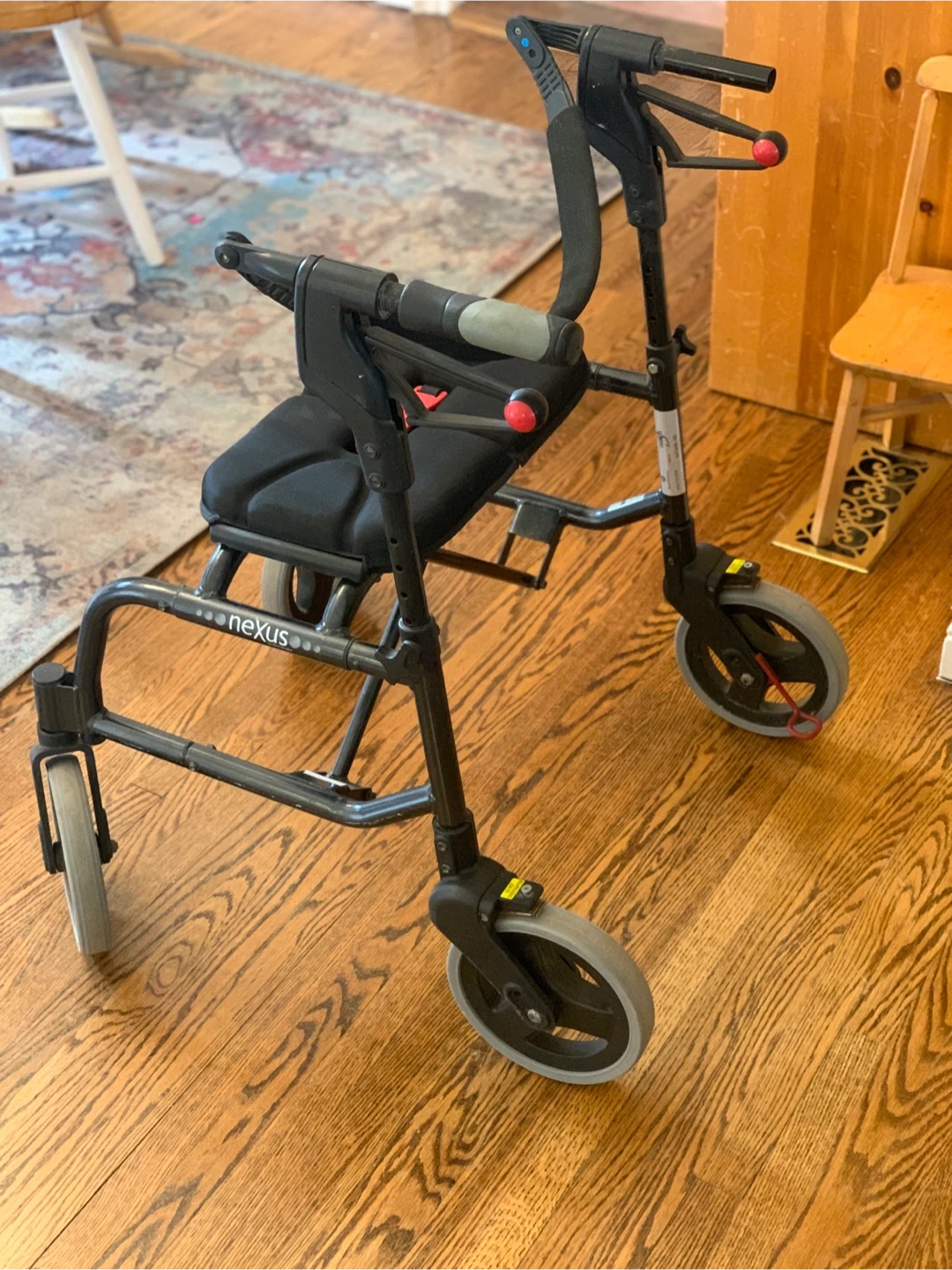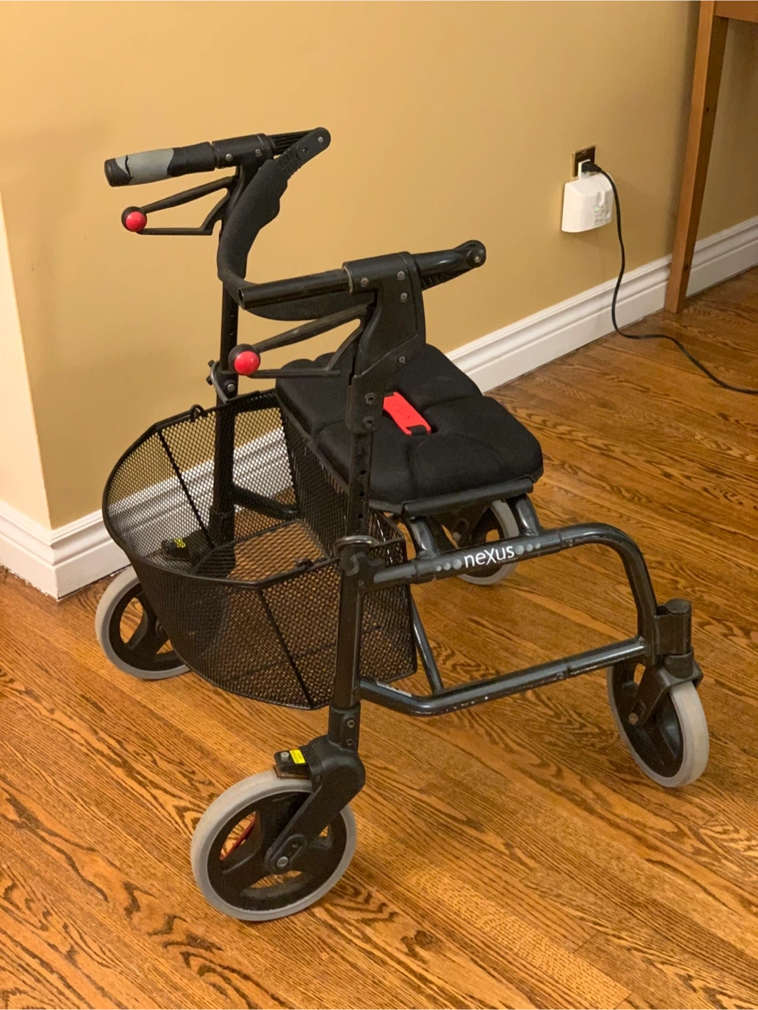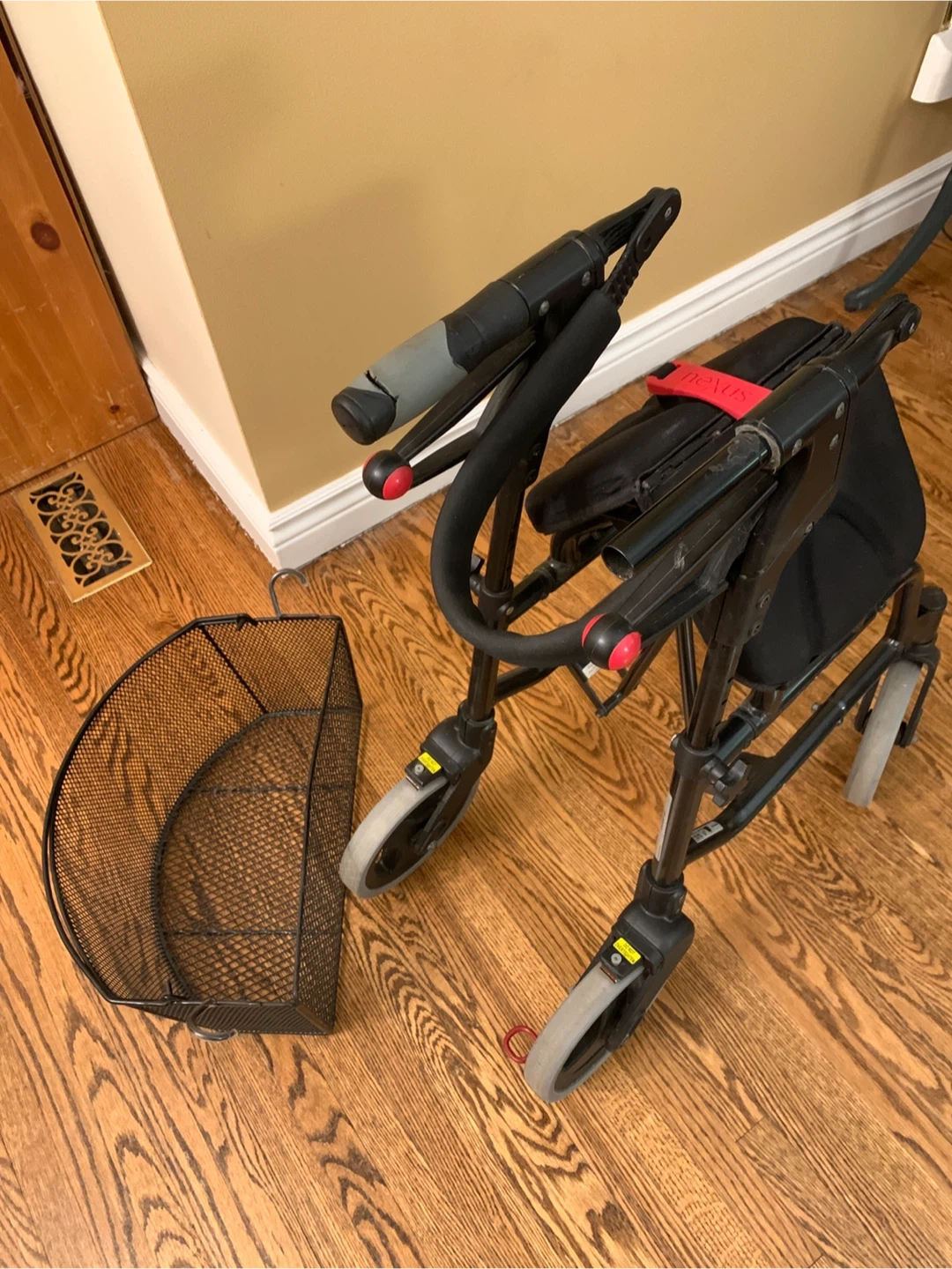 Nexus brand Rollator Walker for mobility assistance. Foldable and lightweight for portability. Comes with removable metal mesh basket (for groceries, oxygen tank etc ). Hand grips need replacement otherwise in very good condition. 19 inch seat height, 7.9 x 1.2 in wheels, 250 lb capacity.