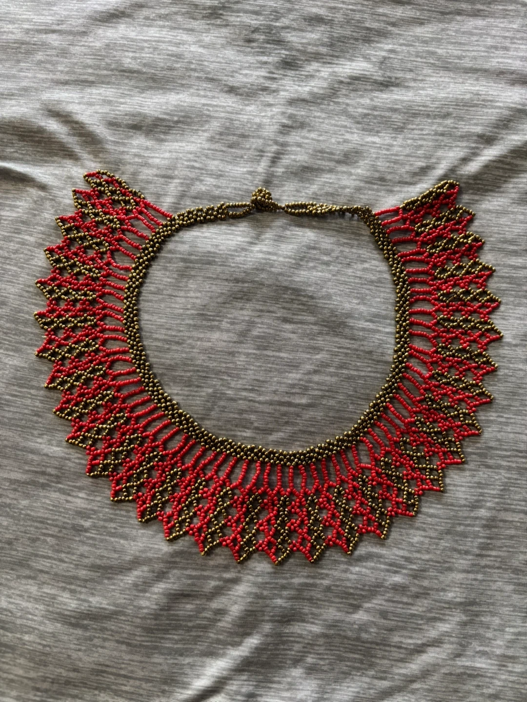 Beautifully hand beaded necklace in red and gold. It measures approximately 18 inches in length.