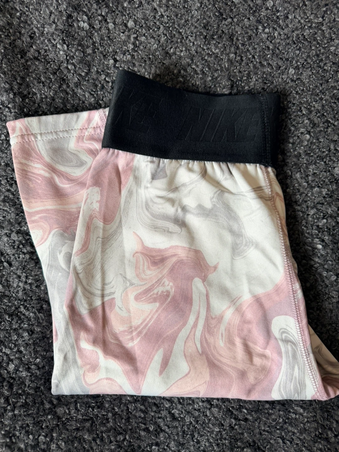 These Nike Dri-FIT leggings for women are size XS and feature a fun pink swirl pattern. They're made with a comfortable and breathable fabric for active days. They offer a snug fit and are great for workouts or casual wear.