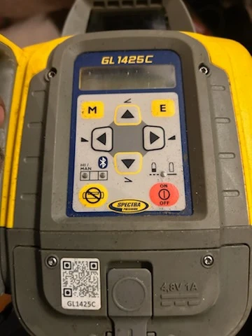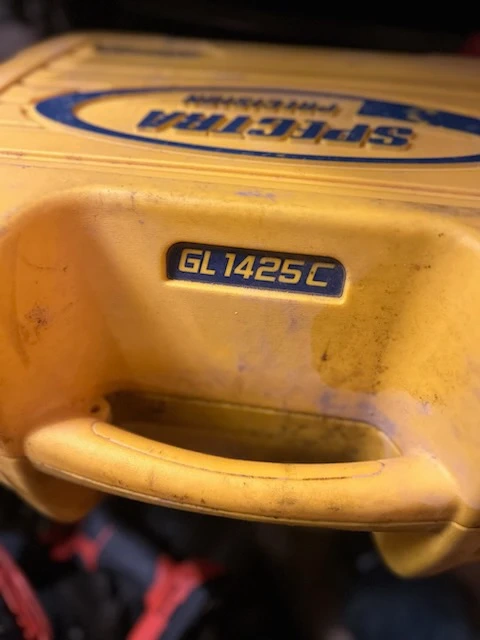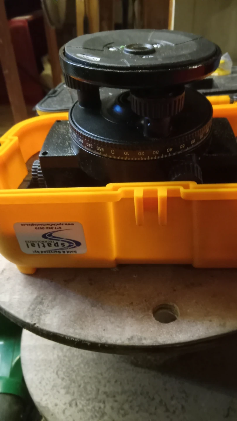 This is a Spatial Grizzly 24 leveling instrument. It's in a yellow and black casing with a durable orange case for transport. Includes all protective foam padding.